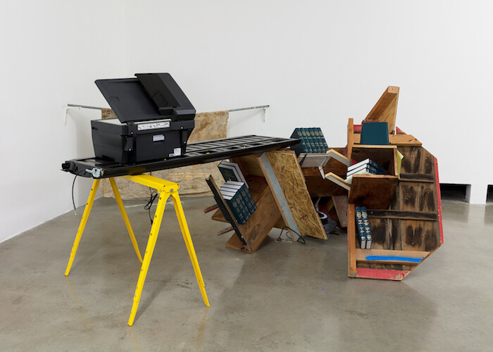 The largest structures in the exhibition are “rigs” meant to function in another time and place: a wind tunnel with the fans unplugged, a printer/scanner without power. In one corner, on a dirt-brown tarp, slides of Smithsonesque phrases flash with the rhythm of his 1972 essay “The Spiral Jetty”: “Northeast by East—Parenting, Gender/sexuality, sand, rocks, prison, access road”; “West – Other Media, Romance, sand, salts, carbon dioxide wells, mud, saltwater.” Nearby is a truck tailgate, black and smooth and never used, one end propped up by a metal sawhorse and the other by shelving made of sawed-off decking. On these canted boards are the green-bound volumes of West’s Annotated California Codes, a scholar’s edition of the state laws. There are nine volumes concerning water. Penal: 11 volumes. Health and safety takes 27. The printer/scanner sits on the tailgate, as if you could make your own copy of these obtuse rules (from a prohibitively expensive bound set, no less). It’s a nod to democracy, or the democratization of law—but it’s unplugged: the idea is petrified. What remains is Bailey’s habit of leaving reading material “lying around,” providing a syllabus without direction or order.