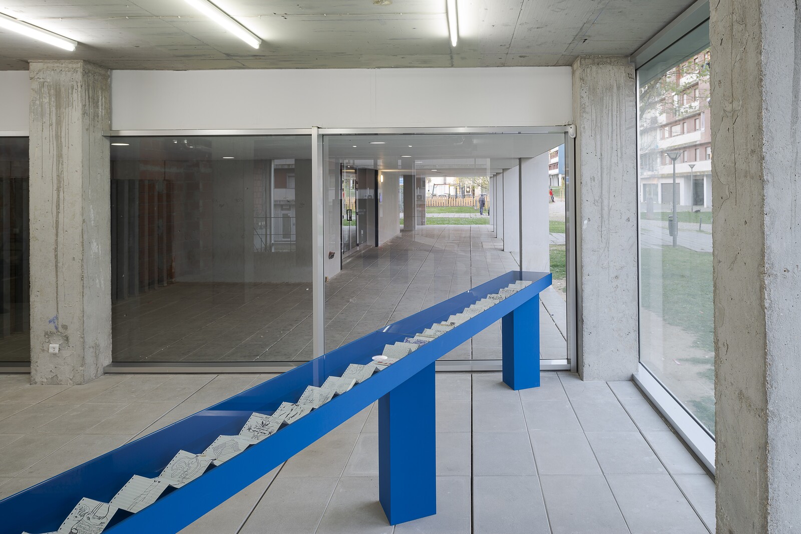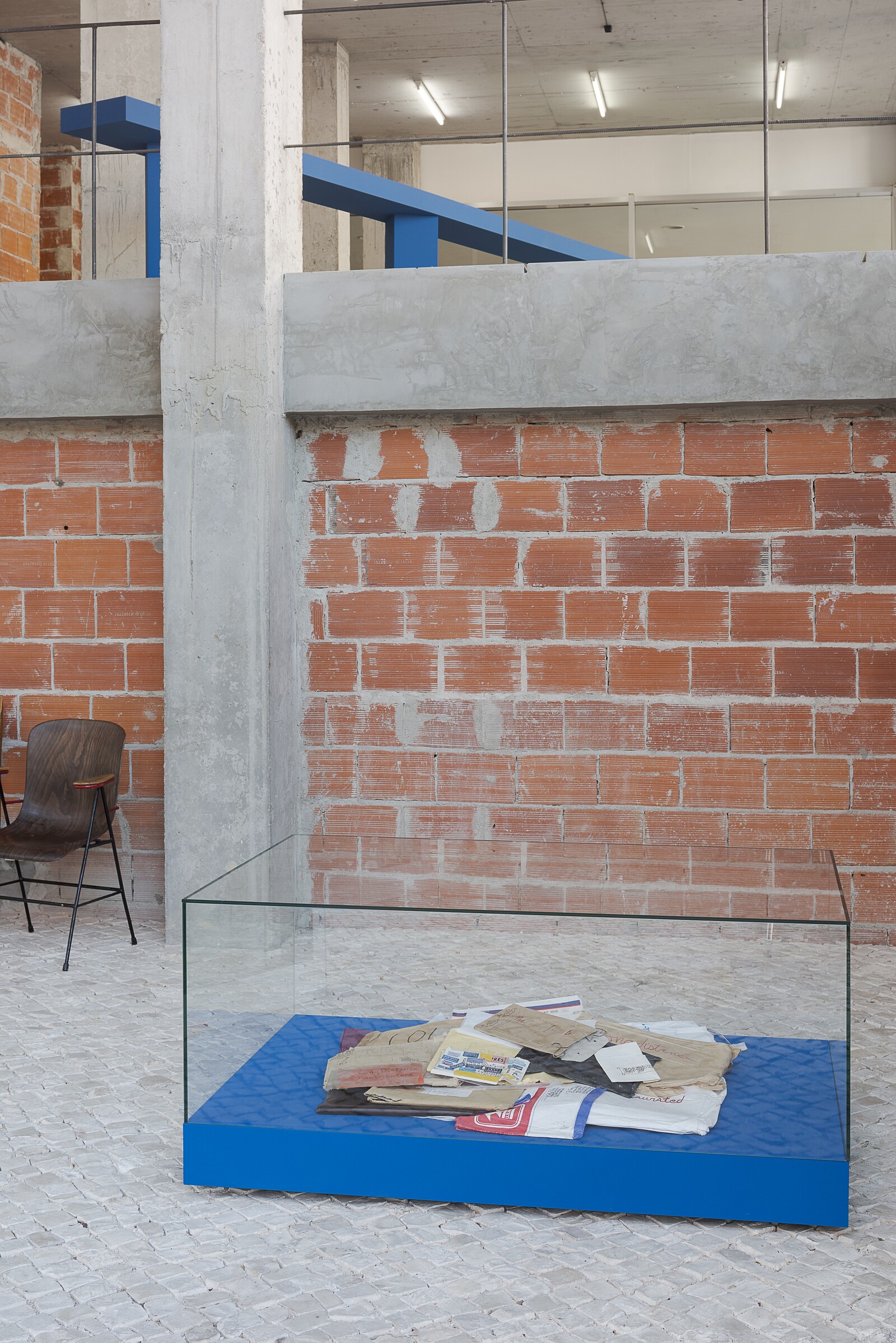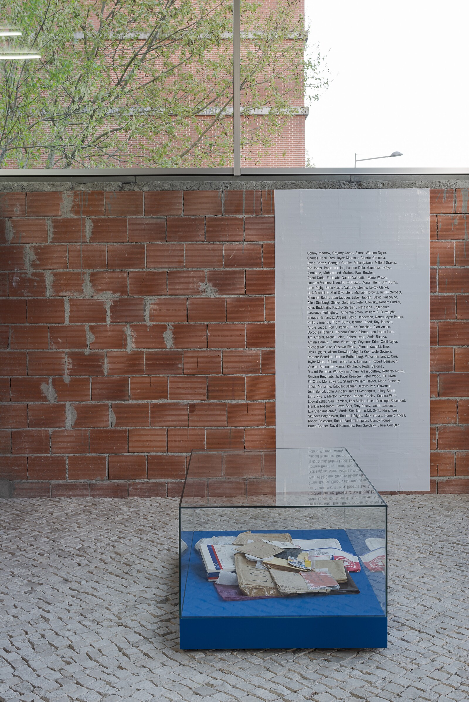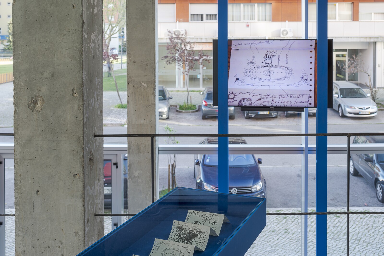 At the heart of “Ted Joans: Exquisite Corpse” is a peculiar version of the famous Surrealist game that poet, musician, and artist Ted Joans initiated in 1976 and which ended in 2005, two years after his death. As the title suggests, Joans conceived Long Distance Exquisite Corpse as a travelling exquisite corpse that would find its 132 invited contributors in different settings and distant geographies. The result is a more than 30-foot-long chain of drawings and collages on the type of perforated paper used by dot matrix printers in the mid-1970s, presented here in a blue vitrine that extends diagonally across the width of Lumiar Cité’s first floor. The graphic approaches vary from abstract doodles to fragments of poetry and cartoonish figures. Reigning among them, as one would expect, are contributions that reflect the interests, signs, and methods of Surrealism.