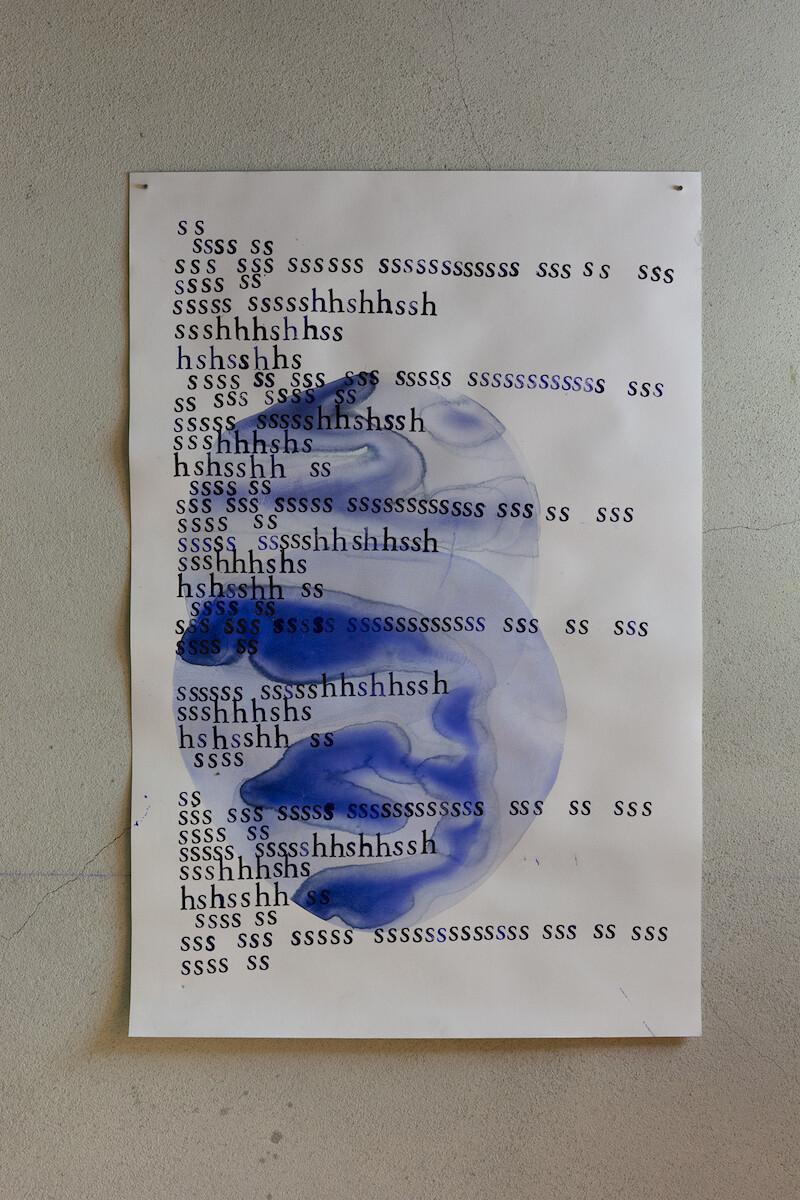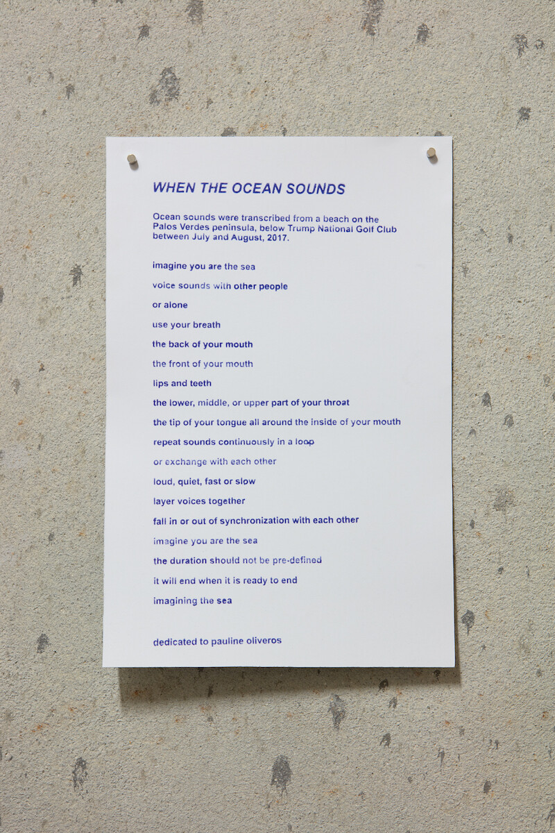 In the exhibition at Belo Campo, the artist expands on the temporal continuities between the body and the sea. When the Ocean Sounds (2018) is a set of 51 scores from a vocal performance for which he transcribed the sound of the waves breaking on a rocky cliff in Palos Verdes, California. Distributed digitally and as an exhibition handout, the notations are accompanied by a set of instructions that Horvitz reproduces with a stamp, dedicating it to musician Pauline Oliveros. The evening before the exhibition’s opening, the scores were performed live at Praia da Azarujinha, near Lisbon, creating a transoceanic dialogue, an embodied conversation between the Atlantic and Pacific. A photo from the event is hung at the entrance to the gallery, encouraging visitors to perform the scores with their own voices, relying on the acoustic properties of the concrete basement for an oceanic worldview.