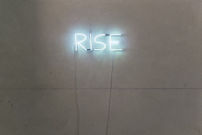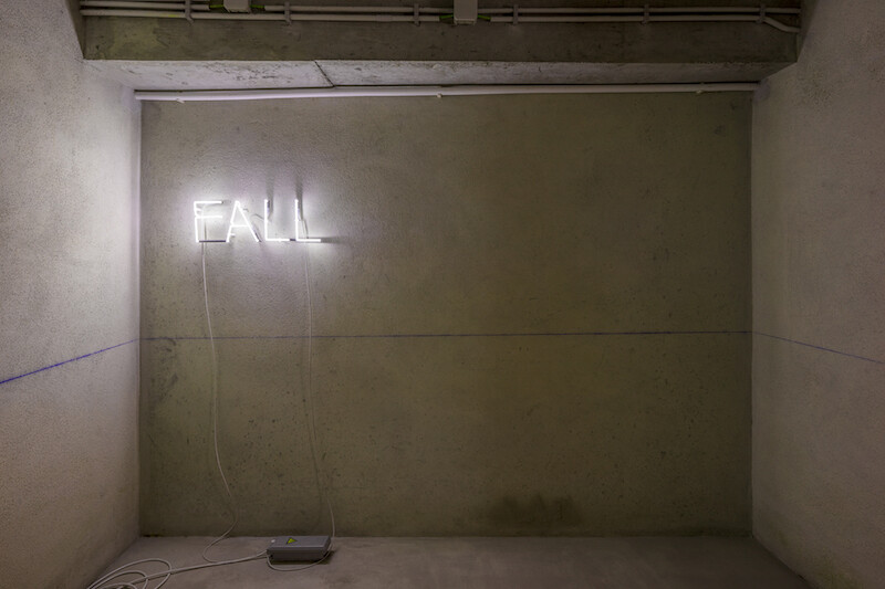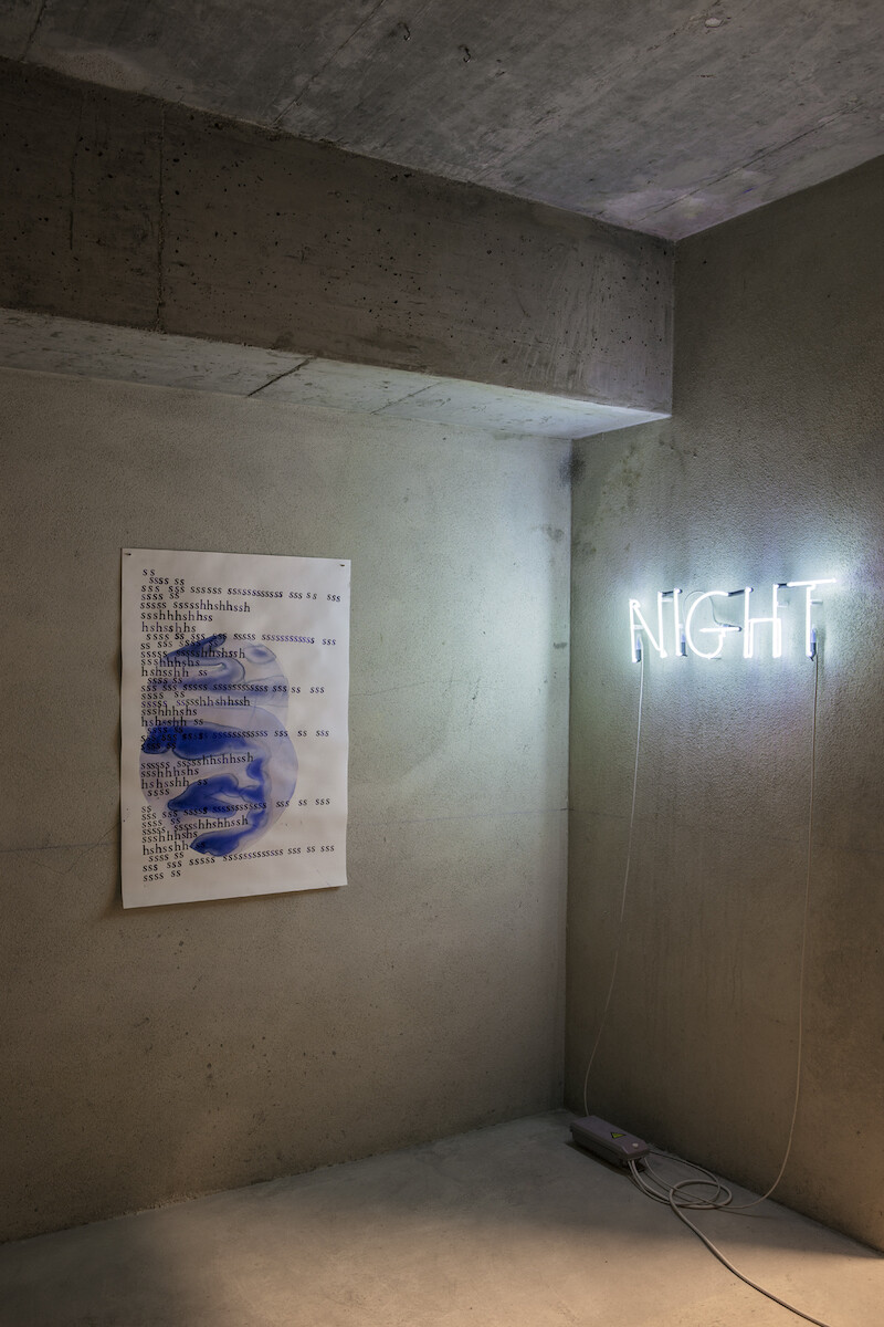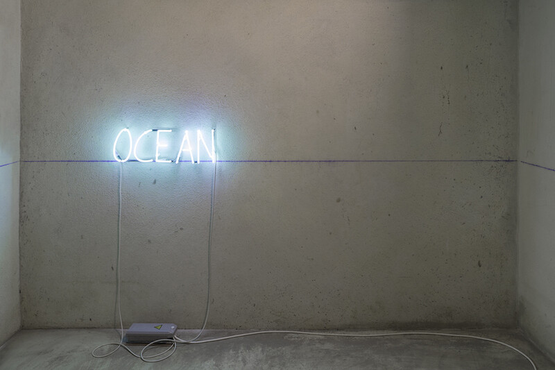 Across the space are nine watercolor scores from When the Ocean Sounds, made in ink, sea salt, and sea water on paper. The titles of the pieces reflect movement and time, as in Big Waves Coming from the Distance, Bubbles of the Surface of the Water, and Soft Wind on Water. The dampness of the underground space has caused the salt crystals to seep from the paper, creating a tinted blue imprint on the floor, which, in turn, challenges viewers to further consider the agency of the sea. Traversing the three small rooms, an undefined horizon marked by a construction line parsing the basement charts the position of four neon lights that together form the work’s title, Ocean Rise Night Fall (2018). It is a proposal for a tidal philosophy that connects the long vistas of history with the caveats of the present. From the early days of colonial expansion to the onset of exploitation of deep seabed mineral resources, this unsteady motion is a deliberate challenge to complacency.