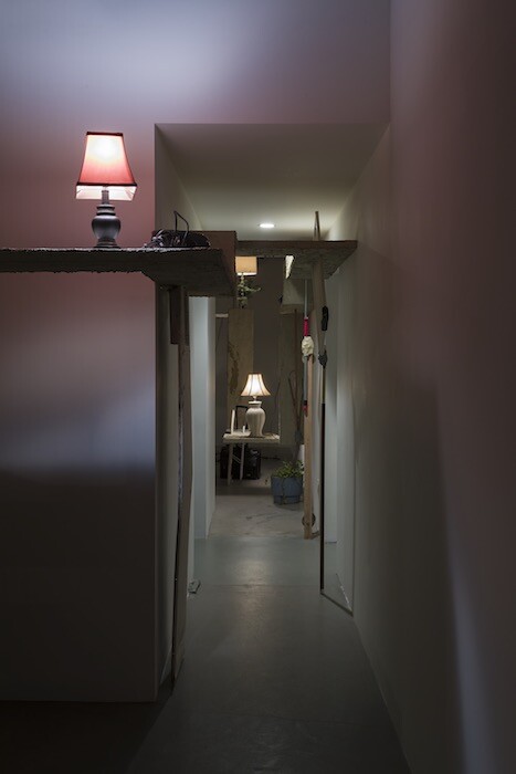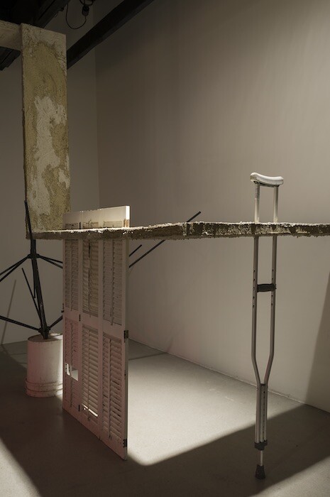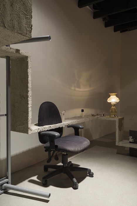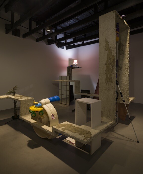 From such healthy competition should follow modern comforts for all—but something has gone wrong. Running through the rear of the gallery, like a strip of calcified virtuality, is the installation Porous, Poor us, Por us. A stuccoed shelf or plank snakes between rooms, over doorways; interpenetrated and supported by manufactured, captive junk: the extendable handle of a rolling suitcase, a ROAD CLOSED AHEAD sign (crumbling infrastructure, anyone?), half a Jacuzzi, an office chair, a crutch. The rooms are atmospherically dim, lit ochre by small lamps, casting the wares in a state of disuse—a thrift-store or sidewalk-sale grime, if not quite landfill. Distributed along the shelf are three boom boxes, which contribute recordings of three auctioneers—Christie’s, QVC, and a cattle sale—to the persistent cries of politicians and dogs. The sculptural environment—architectural, scatological, and practical, in its precarious, un-ideal way—resembles a bent timeline, caked with guano-like gray, recalling the promises of the past three decades, unimproved-upon, now studded with the trash of today. Money is money? Stuff is stuff? In this, our tautologies have yet to evolve—though for the planet’s sake, they should. The joke, for Snyder, is at everyone’s expense—most of all those too self-absorbed to get it. Would that us tail-chasers would listen up.
