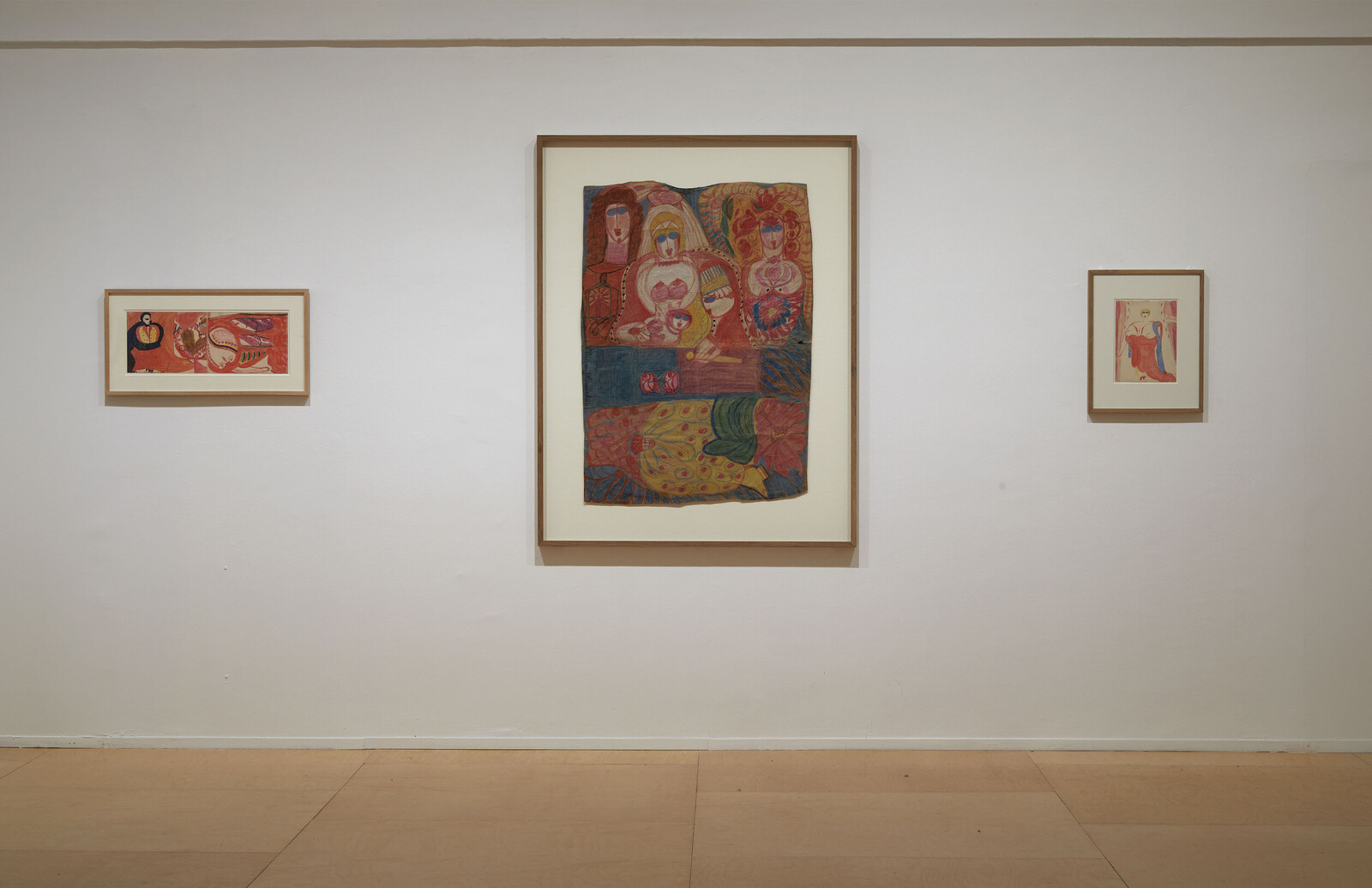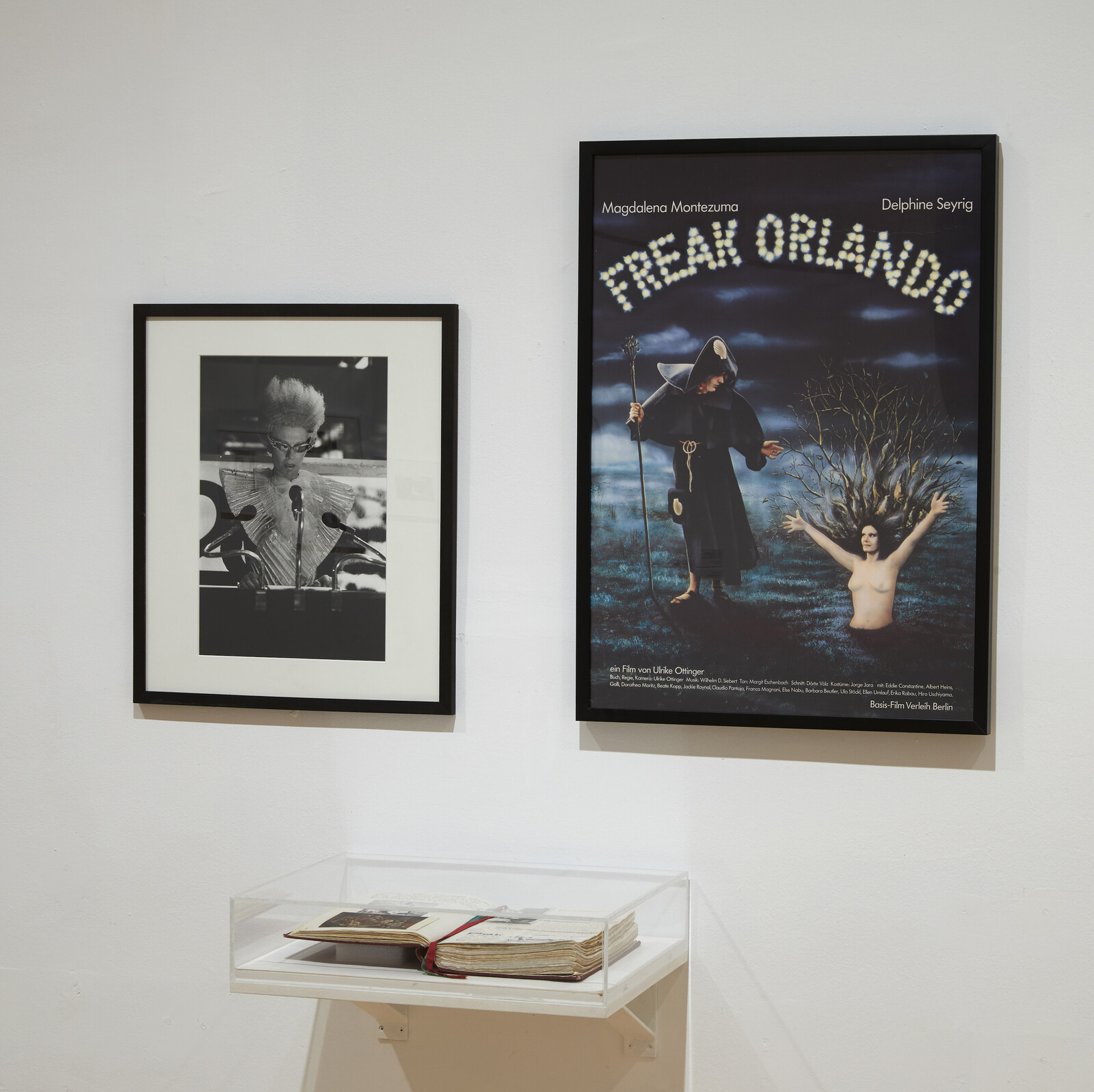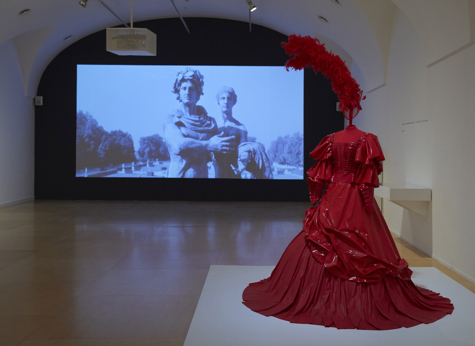 The show unfolds chronologically, in thematic sections. The layout is simple, without frills, with an impressive amount of documents on display. Black and white abound. There is nothing on Seyrig’s life before 1961, her year of birth as diva, marked by the release of Nouvelle Vague cult movie L’Année Dernière à Marienbad [Last Year at Marienbad] by Alain Resnais. In the film, projected in the exhibition’s opening room, Seyrig features as a glamorous and mostly silent mannequin clad in Chanel suits. As the curators remark in the catalogue, from then onwards “Seyrig’s initials, D. S., thus became synonymous with dé-esse, French for goddess.” The walls are lined with rows of framed stage photographs, documenting Seyrig’s subsequent, invariably seductive characters, constructed for the pleasure of the male gaze by directors such as Luis Buñuel, William Klein, Claude Régy, and François Truffaut. In contrast, the monumental, strawberry-red costume and feathered headdress worn by Seyrig in Ulrike Ottinger’s Freak Orlando (1981), which stands theatrically in a corner, represents the actress’s emancipatory collaborations with female directors like Marguerite Duras (India Song, 1975) and Chantal Akerman, for whom she played the protagonist of the cult film Jeanne Dielman, 23, Quai du Commerce 1080 Bruxelles (1976). Its chilling last scene is reproduced on seven monitors in Akerman’s installation Woman Sitting After a Killing (2001).