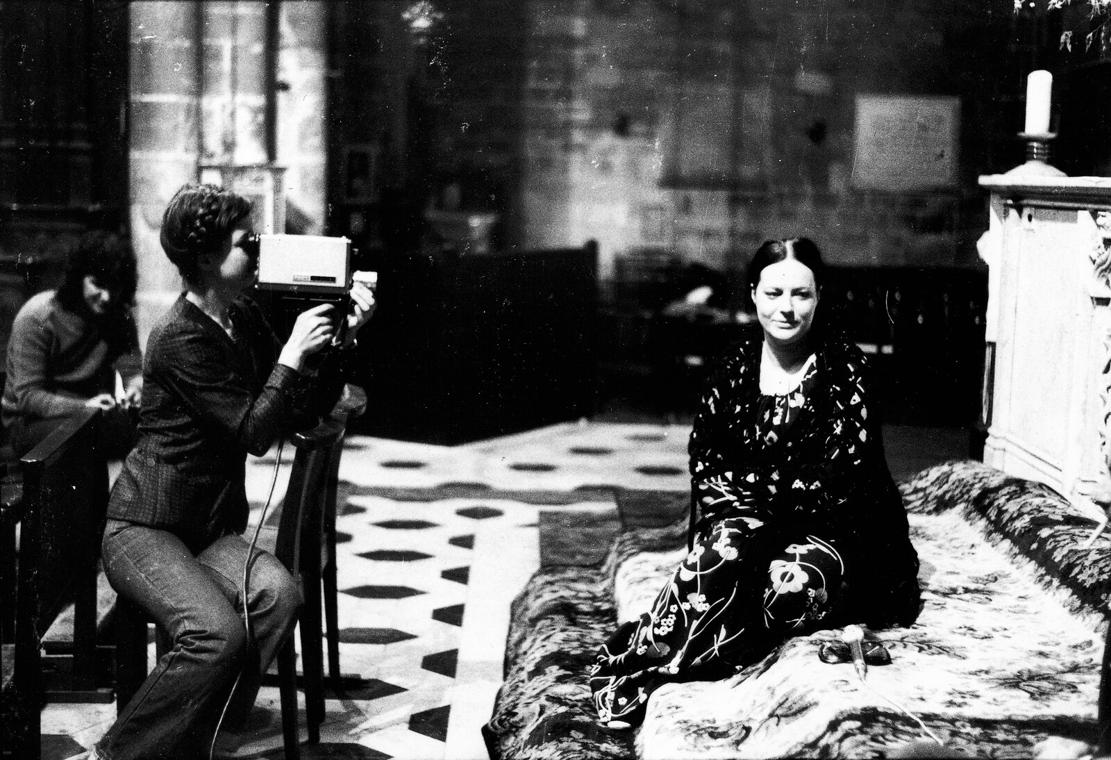 In the mid-1970s, Seyrig met Roussopoulos—the second French director to acquire a Sony Portapak, after Jean-Luc Godard—who offered free training sessions on shooting and editing videos in her Paris apartment. Seyrig then moved behind the camera. In her own words, “it was a revelation, an enormous pleasure, an incomparable revenge.” The exhibition shows how Seyrig’s work—both as an activist (in 1971, for instance, she signed the Manifesto of the 343, self-denouncing her illegal abortions) and as a generator of images, in collaboration with various allies (amongst them, her partner Sami Frey)—intertwined with the activities of the other members of Les Insoumuses, before and after the formation of the group. We see videos, made by Roussopoulos, charting women’s demonstrations, a meeting of FHAR (Homosexual Front for Revolutionary Action), a group of sex workers occupying the church of Saint-Nizier in Lyon (Les prostitutées de Lyon parlent [The prostitutes of Lyon speak out] (1975). Meanwhile, in Accouche! [Give birth] (1971) Wieder analyzes the violence performed on female bodies by the institutional control of reproduction.
