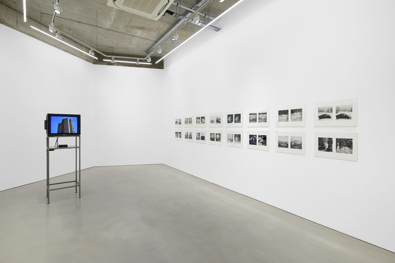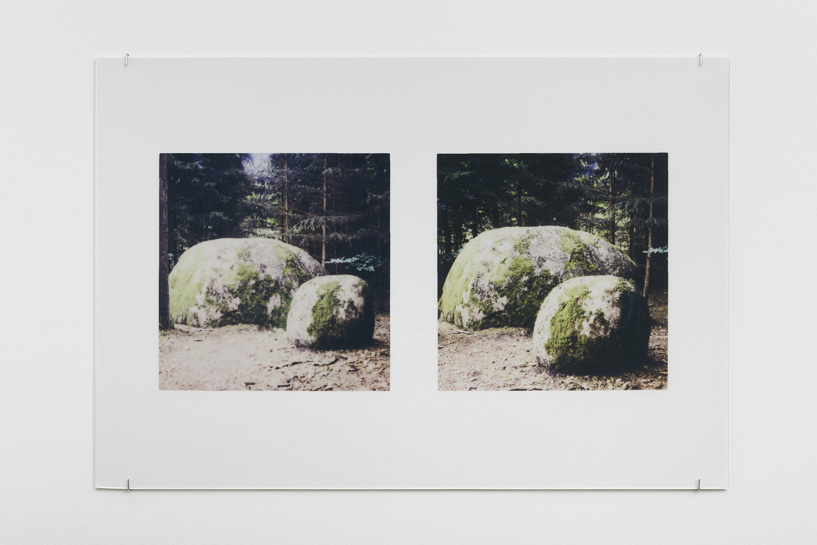 On the wall to the right is “Akmenys Po Du” (2023): a grid of sixteen pairs of photographs—each of a different boulder, each incidentally recalling the rock that marks the middle of Europe. These vast stones, which mysteriously appear across Lithuania’s landscape, feature prominently in local folklore. Narkevičius’s exquisite enlarged Polaroid prints pay testament to the majesty of these sites: to the country’s beauty and heritage. The display of numerous stones as doubles in a grid, though, undermines their power as singular, miraculous objects. This simultaneous celebration and subversion is typical of the work on display here—which upholds contradictions between singularity and multiplicity, essence and resemblance. Narkevičius concludes his journey in Europa 54° 54′ – 25° 19′ with a flippant denial of its significance: he describes feeling that he “had been there before,” that it “could have been anywhere in Europe.” His work articulates post-Soviet ambivalence—delighting in the histories and mythologies of his country while remaining skeptical of the construction of origins and essences central to nationalist ideology.