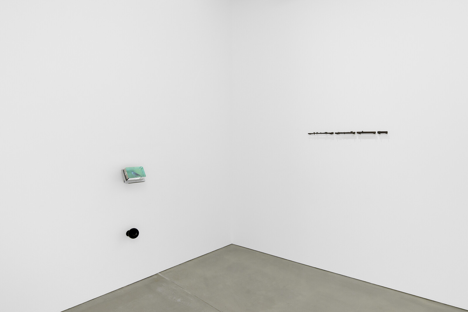 The centerpiece of Deimantas Narkevičius’s current exhibition at Maureen Paley is a holographic screen—a small block of glass on a sleek metal shelf. A nightingale appears in the glass and lands on a branch that hangs there, while audio plays of a flute mimicking birdsong in sync with the movements of its beak. It flies out of view again and then returns, left and right, left and right. On an adjacent wall is another branch of sorts—a bark-like bronze cast of the cavities inside a flute—and nearby hang two small black-and-white images: a 1920s photograph from the Lithuanian State Archive of a soldier playing the flute by a window and a digital recreation of the same scene from directly outside the building. This perplexing constellation of objects is named after the shadowy figure in the photograph, The Fifer (2019).
