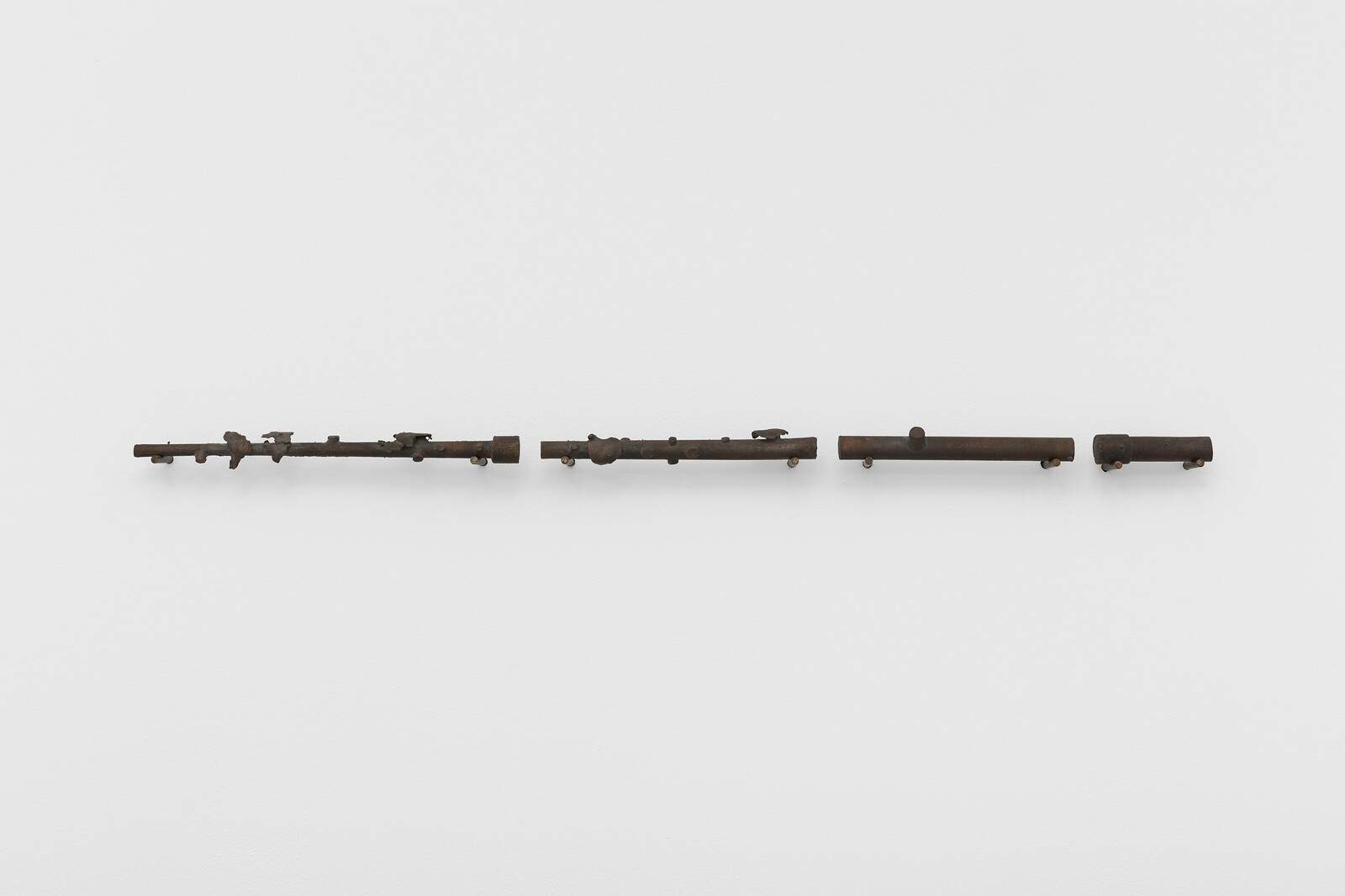 Holography represents the height of illusionism, elaborately conjuring animated three-dimensional images. But the nightingale’s restless movement in and out of frame continually calls attention to the screen’s edges, where the projection falters and the empty glass block becomes visible. The illusion is further ruptured by the flutist’s birdsong which, isolated from any ambient sound, is unconvincing. Each item here performs a failed attempt to find depth, confronting us with only surface. Narkevičius materializes the interior of a flute by creating a solid mass with only exterior. He claims the cast captures the instrument’s “essence,” but it resembles another object altogether—a branch. And he responds to an obscure old photograph by reproducing the scene from the outside. Instead of offering a revelatory view into the building, the resulting picture shows just window reflections and brick wall. It shuts us out, confirming our distance from the original photo. Narkevičius’s work renders the search for depth or truth futile: subjects (the nightingale, the flute, the fifer, the past) metamorphose and disappear in his hands.