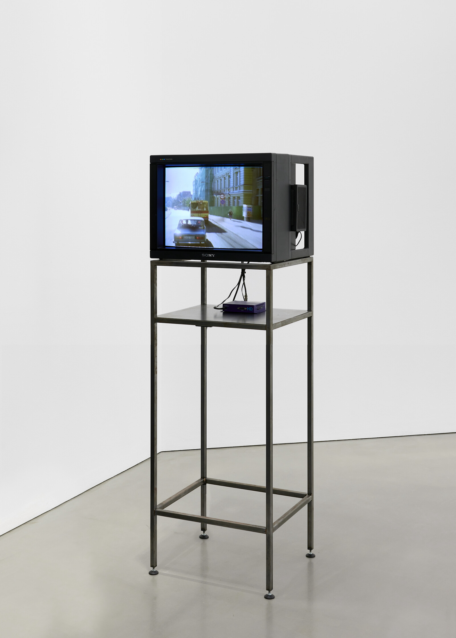 The artist’s early, nine-minute film Europa 54° 54′ – 25° 19′ (1997) plays on an old TV in the gallery’s larger room. It documents a drive he took “one Friday morning” from his flat in Vilnius to the (much-disputed) geographical center of Europe less than twenty miles away. Trams, buses, and cars roll along; pedestrians wait at crossings and walk past; ornate nineteenth-century facades in the town are replaced by suburban apartment blocks, illuminated by strong sunlight against a clear blue sky. In a monotone voiceover, Narkevičius explains that he has travelled equal amounts east and west of this point, so for him it is the center of time “spent elsewhere.” A smashed-up car lies on the hard shoulder; roadworkers excavate the pavement; two men pass with a donkey. He turns off the main road and eventually completes his voyage on foot, walking across a stream and up a small hill to the stone that marks the spot.