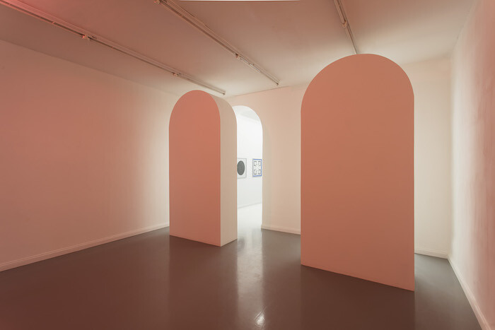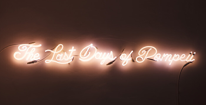 Gli ultimi giorni di Pompei [The Last Days of Pompeii], an Italian silent movie directed in 1913 by Mario Caserini and Eleuterio Rodolfi, was one of the first “Kolossals” of the disaster genre. It opens with a view of Pompeii’s busy streets, where peplum-clad citizens cross a city gate, flanked by two candid stelae. Its plot is based on a novel of the same name published in 1834 by English baron Edward Bulwer-Lytton, inspired by an eponymous 1833 painting by the Russian master Karl Bryullov, who, in turn, had been entranced by the opera L’ultimo giorno di Pompei (1825) by Giovanni Pacini—fiction follows fiction. “The Last Days of Pompeii” is also the title Delia Gonzalez chose for her second solo at Galleria Fonti, Naples. It’s spelled out in a pink neon sign installed above the entrance door, which infuses the gallery’s main room with a crimson glow, refracted on the surface of two monumental white stelae in drywall, The Osiris Gate I & II (2017), shaped after the negative space underneath arches in the wall. The floor, otherwise empty, is filled with the radiating electronic beat of Vesuvius, the last track—composed for the occasion—of Gonzalez’s just released album “Horse Follows Darkness” (DFA Records, 2017).
