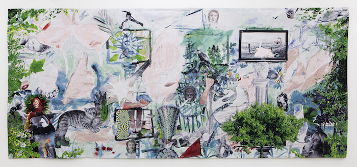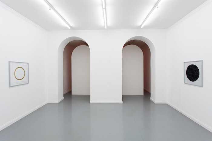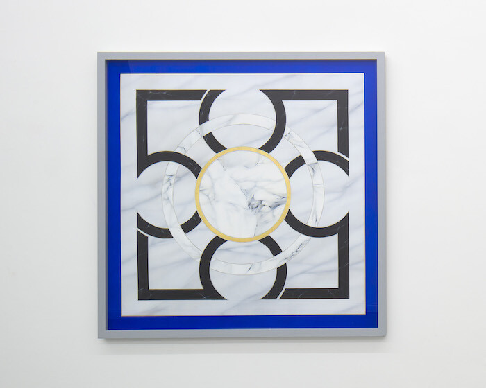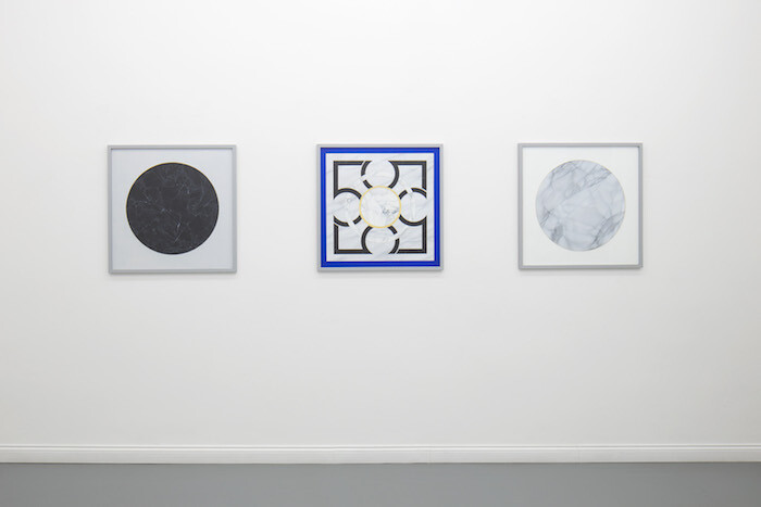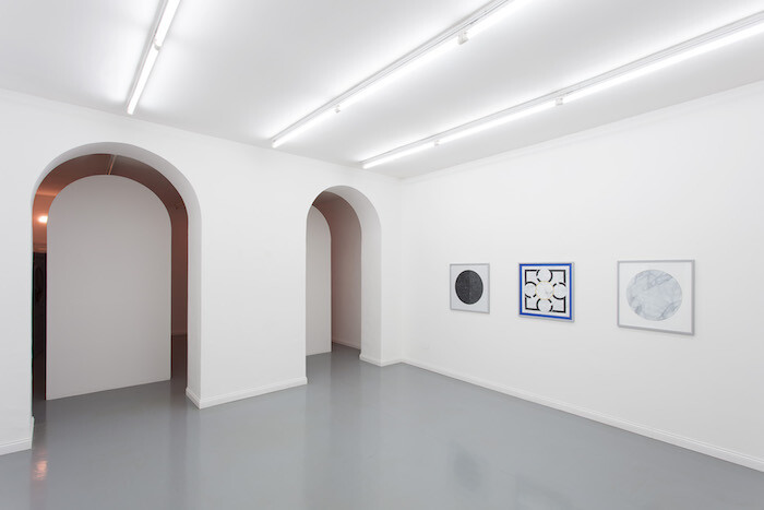 In the second room of the gallery, which has retained the intimate scale of a private apartment, the artist has hung seven framed paintings of identical size on paper (The Hour of Departure, The N° Five, Duelle (Leni), Jupiter, The Flowering of the Crone, Conjurer, Don’t Exclude the Moon, all 2017), mimicking geometric marble mosaics with illusionistic perfection, by means of graphite, acrylic, and golden leaf. Their recursive circular motif alludes to the moon and Isis as lunar goddess, but it also reproduces the oculus (oeil-de-boeuf window) inserted in the gallery’s entrance door, as another site-specific reference. For Gonzalez, antiquity and its dissolution are just a mood, a projection, an abstract fantasy, where the imagination is free to gallop. Images can be found elsewhere. Currently based in Athens, the artist describes her album as “a soundtrack for a Western movie,” because, after moving back to New York from Berlin with her son, she thought “America felt like the Wild West.” Hence her return to Europe and its post-ancient South.