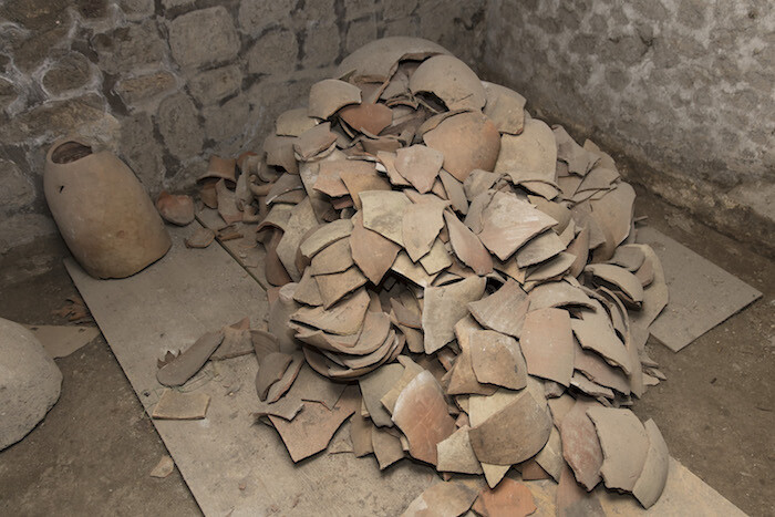 “Napoli is a Pompeii that has never been buried,” Italian writer Curzio Malaparte famously remarked in his novel La Pelle [The Skin] (1949), a depiction of Naples as city of ruins after the World War Two bombings, the occupation by Allied forces, and the last (thus far) eruption of the Vesuvius, in 1944, when a 5 km-high cloud of ashes was first recorded on film. A room filled with bombarded and destroyed archeological findings lies at the core of “Pompei@Madre. Materia Archeologica,” another Neapolitan exhibition delving into Pompeii’s mythopoiesis. Spanning three floors of the museum, it is jointly curated by Andrea Viliani (Director of MADRE) and Massimo Osanna (Director of Pompeii’s Archeological Park), so that contemporary art and “archeological matter,” as the subtitle goes, are intertwined. On the third floor, Adrián Villar Rojas’s rocks and decaying food from the series “Rinascimento” (2015), presented as “submerged” in a white-cubish case, meet the viewer along with the original first diaries of the excavations, drafted in 1780.