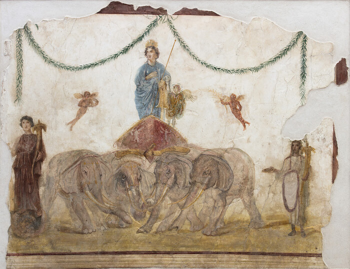 In a section curated by Luigi Gallo, piles of books revive Pompeii’s literary allure; for instance, Malcolm Lowry’s novel Present Estate of Pompeii (1959) is open on its incipit, where the protagonist seeks refuge in the Restaurant Vesuvius to avoid seeing the ruins, too sinister for him. Photographs by Luigi Ghirri, Nan Goldin, and Victor Burgin, sculptures and installations by Maria Thereza Alves, Trisha Donnelly, Haris Epaminonda, Iman Issa, Maria Loboda, and Goshka Macuga, to name but a very few, open up iconographic dialogues with vases, everyday objects, fragments of furniture, burnt foods, frescoes, votive lamps, statues, figurines. The layout, inspired by the rooms of the traditional Pompeian house, enhances the artists’ fascination for the tangible presence of “matters” emerged intact from the past, thus echoing Bulwer-Lytton’s novel: “walls fresh as if painted yesterday—not a hue faded on the rich mosaic of its floors—(…)—in its gardens the sacrificial tripod—in its halls the chest of treasure—in its baths the strigil—in its theatres the counter of admission—in its saloons the furniture and the lamp—in its triclinia the fragments of the last feast—in its cubicula the perfumes and the rouge of faded beauty.”1 Aby Warburg’s “afterlife (or survival) of antiquity” shines on. On the first and ground floors, the exhibition infiltrates all the rooms of the permanent collection, each devoted to a single work. My favorite encounter, in homage to Gonzalez, was with Rebecca Horn’s installation Spirits (2005), where the artist’s casted skulls and circular rotating mirrors are now accompanied by a multitude of small anthropomorphic columelle, the funerary stelae originally bordering the main streets of access to Pompeii. Ashes to ashes, again and again.
