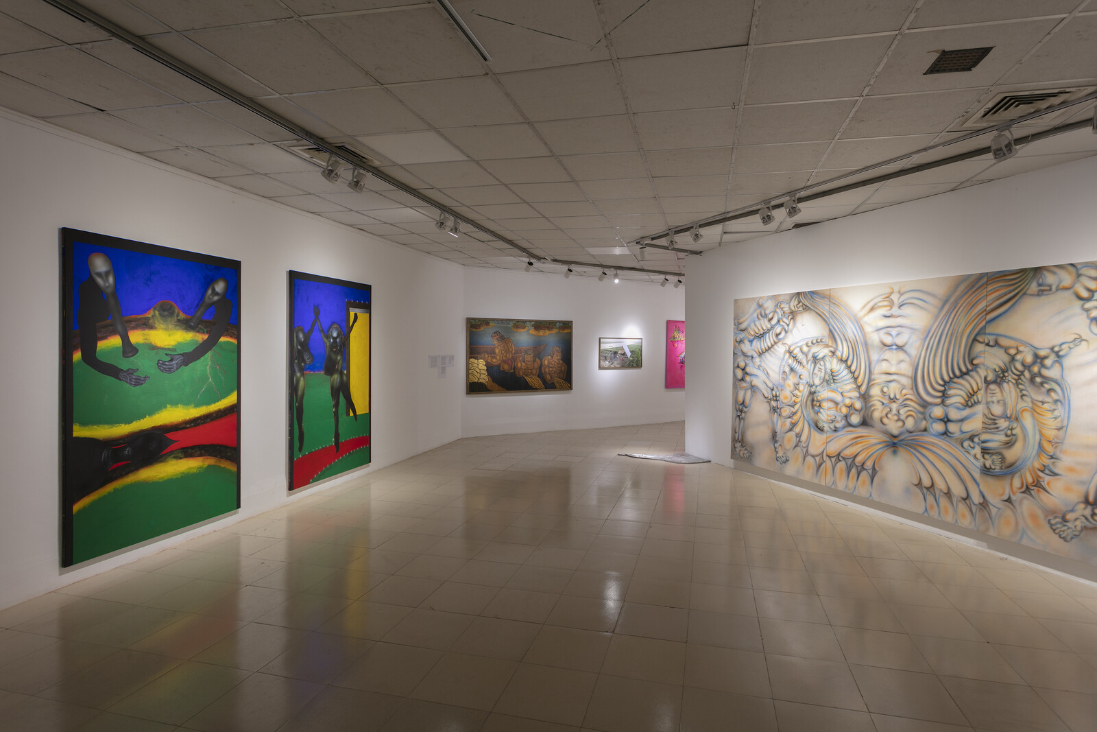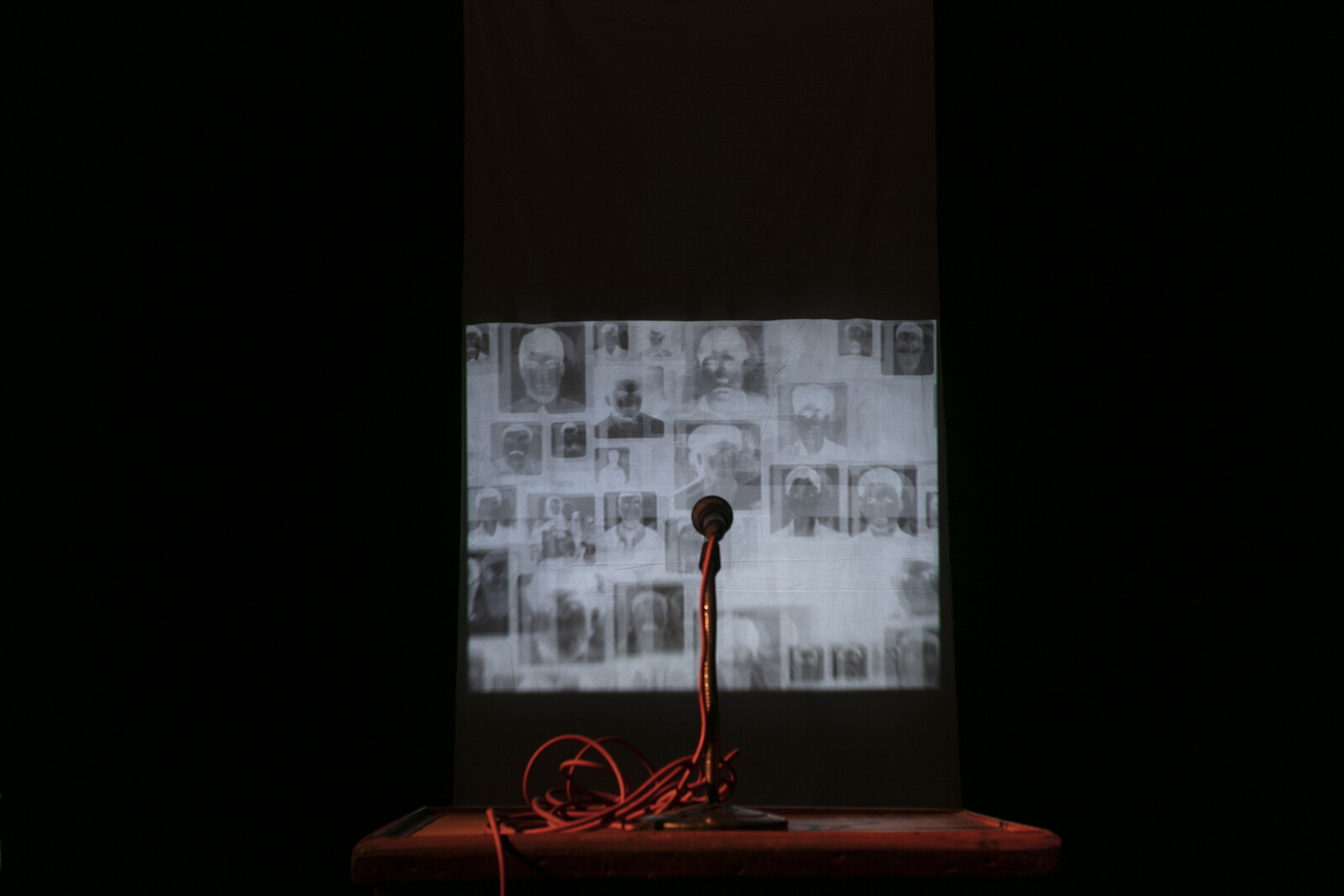 Tucked away in a distant corner of the exhibition, Faysal Zaman’s (un)filled (2021–23) was one of the few works to be vocal in its criticism of the repression and human rights violations that mark Bangladesh’s current political climate. Zaman’s long-term project puts on view photographs of the victims of “enforced disappearances” in Bangladesh through an archive of found images from the internet. Projecting them in front of an unplugged mic, the artist signals the victims’ voicelessness. Impactful works such as this—relegated to the quietest corners of this exhibition—serve to highlight a broader hesitancy to center overtly polemical work.