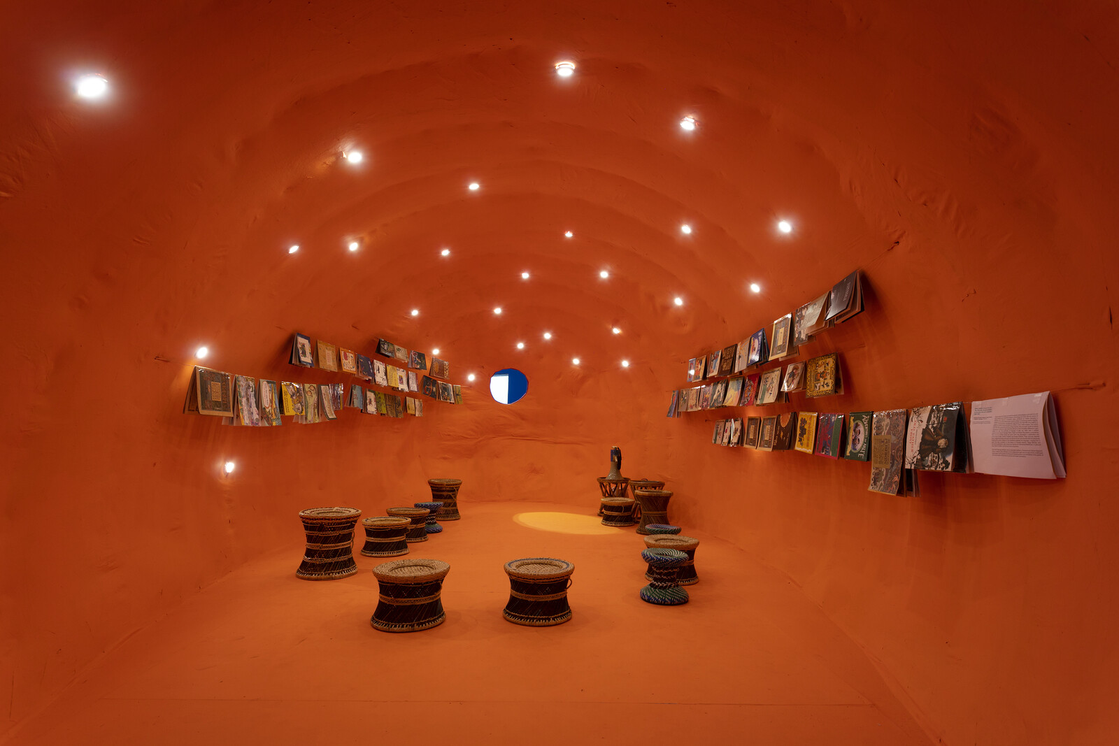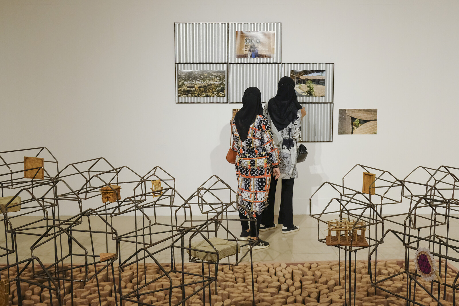 Historic or threatened forms of knowledge were brought to the fore throughout the exhibition. Rizvi Hassan’s project in “To Enter The Sky,” the third sub-exhibition, curated by Sean Anderson, focused on his architectural work at the Rohingya refugee camps in Cox’s Bazar (which recently won him the Aga Khan Award). Hassan’s tactile display allows visitors to engage in the thinking behind his largely collaborative approach to architecture, which in this case involved collecting knowledge and techniques of production from community members. Their needs were met through materials such as palm leaves and bamboo, widely used by the Rohingya in a climate known for its frequent cyclones.