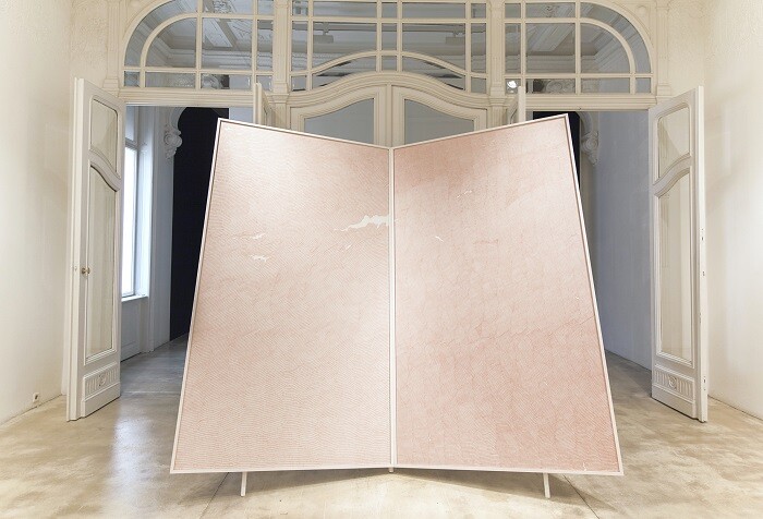 Latimer’s invocation resonates with several works, among them Shakuntala Kulkarni’s four-channel video work Julus (2015), in which a woman dressed in combat gear multiplies into an army of herself in a monochrome, theatrical space. The way she translates different kinds of armor traditionally worn by men—Vikings, samurais—into a skeletal combat-hybrid is stylized and effective. The shallowness of male poses are re-exposed as an image of female power; the armor is not for fighting but for redefining how we think about stereotypes. Like a woman, indeed. Latimer’s poem also corresponds with those works addressing meditation and ritual, of which Waqas Khan’s In the Name of God (2015) is perhaps the strongest. With its gigantic lined pages laid to rest like an open book, it brings to mind hours spent in contemplative study of a religious text. Khan is working with Sufi scripts, but we might as well think of the Bible or the Quran.