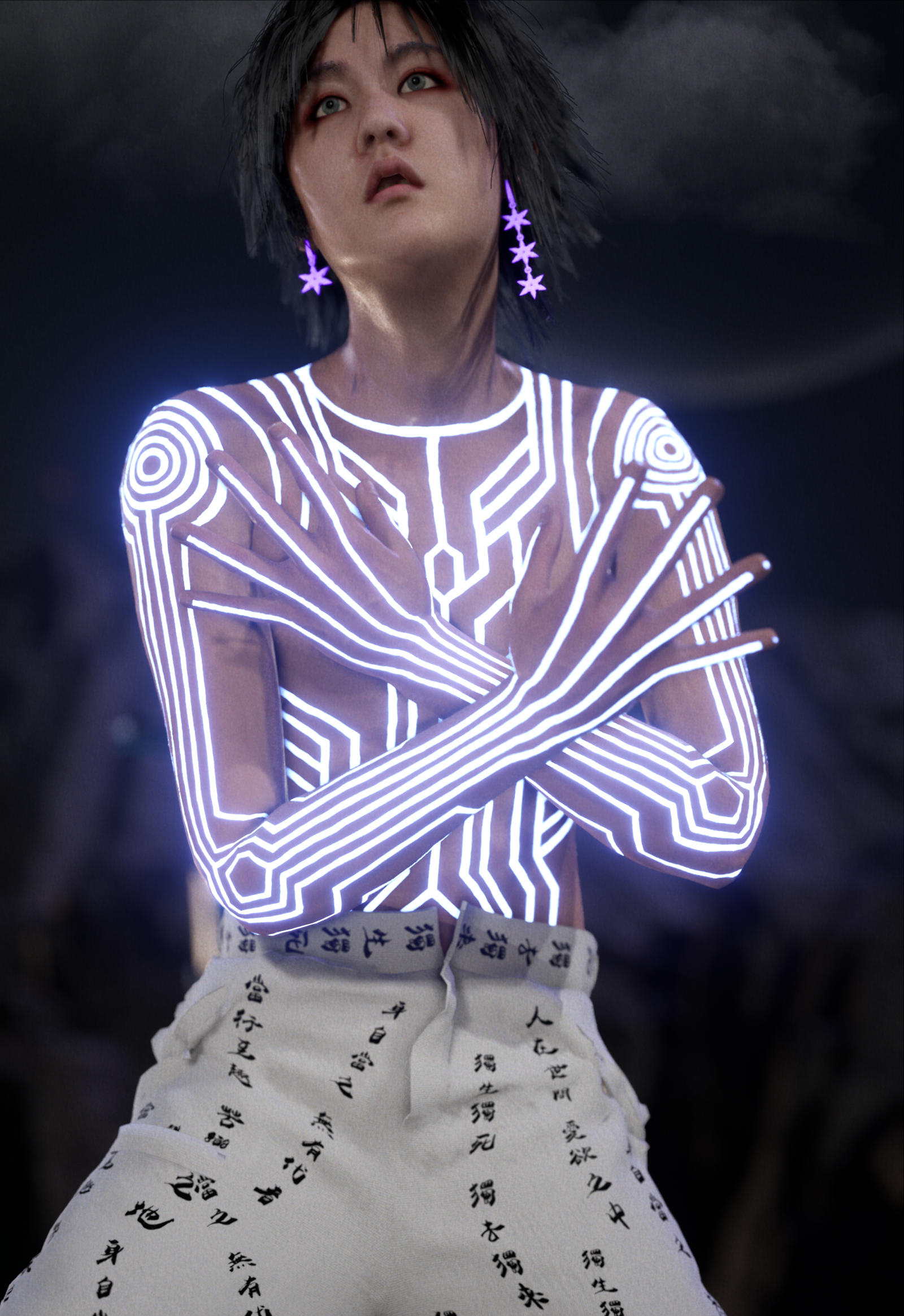 LY: They approached me with a song they believed was a good fit for me. I decided to create something stylistically similar to the Final Fantasy video game franchise. When I played the game, its lyrical soundtrack left an impression, and its main characters resemble DOKU—young, Asian, pretty-boy. I was working with a Shenzhen-based company specializing in facial motion capture. The singing expressions and sequences were fully motion-captured for the music video, whereas many virtual idols have static or rigid faces. We wanted to foreground this technology: the background is expansive, lonesome, and reminiscent of outer space.