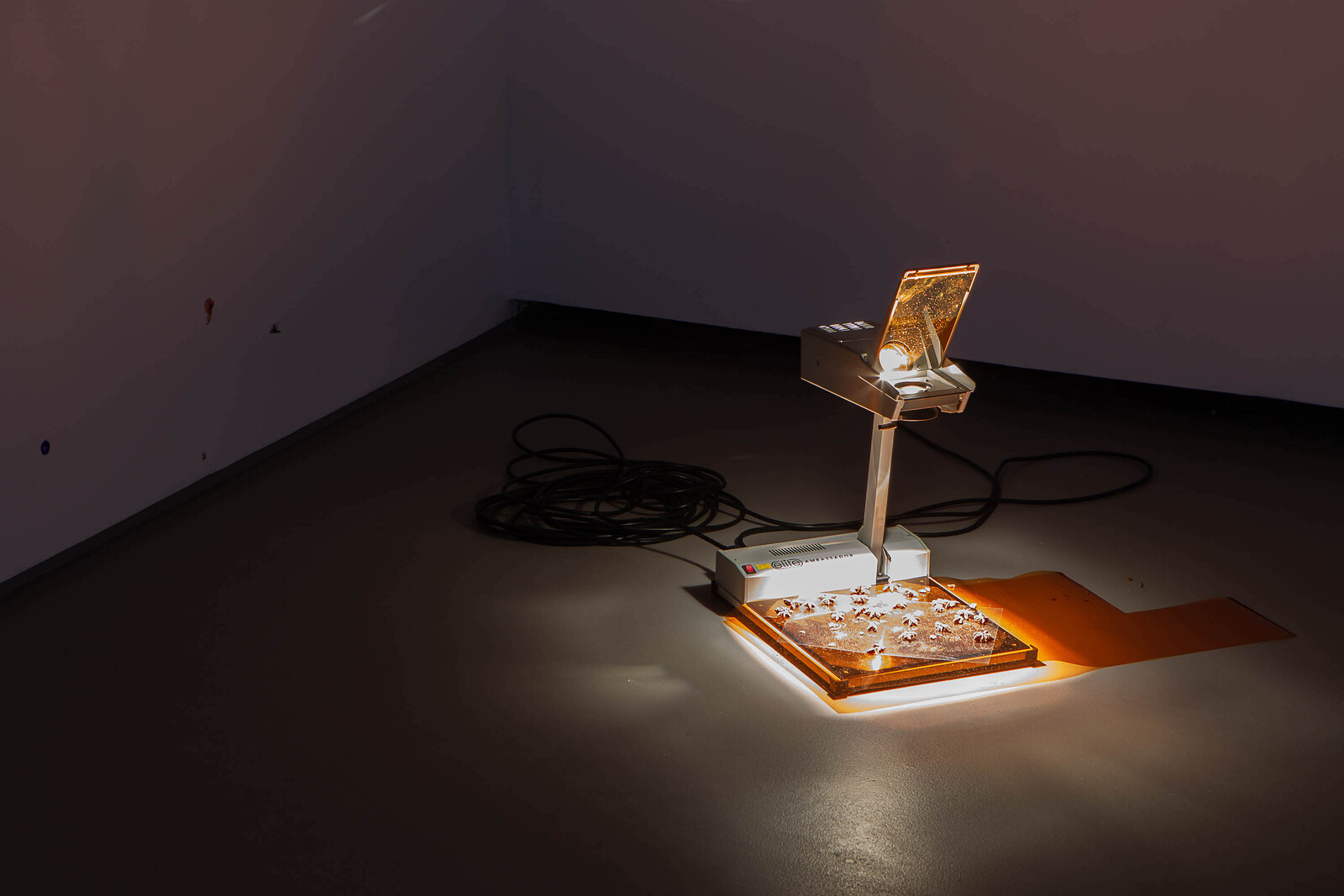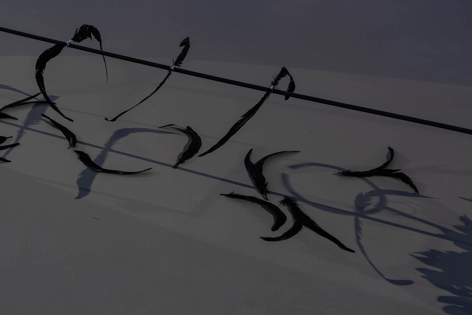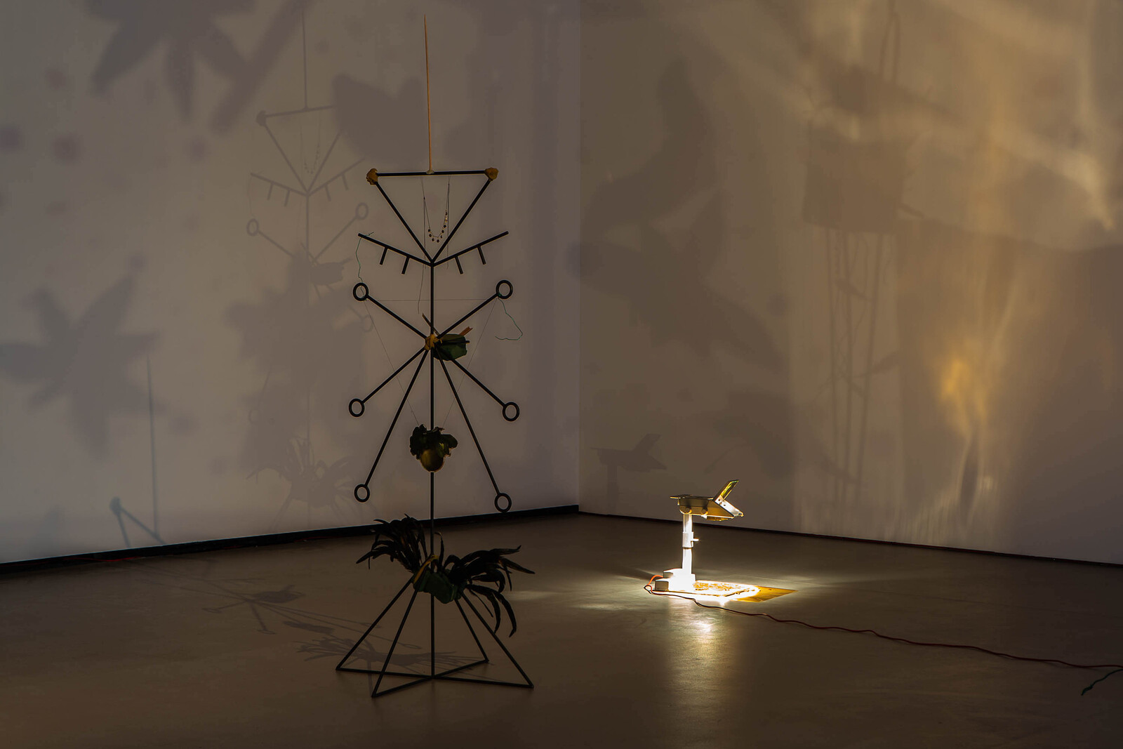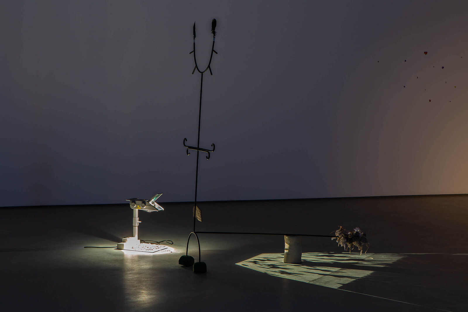 The darkened installation is punctuated by bursts of light emitted from overhead projectors placed on the floor. Star anise are scattered on their surfaces, their shadows cast upon the walls and across the ceiling. Soil—a significant material in Bopape’s work—features in a slideshow of images projected on a piece of cardboard at the center of the installation, showing close-up snapshots of a hand molding dirt and clay. Earth, in this instance, doubles as a reference to burial and the colonial removal of land. The crow feathers heighten the mournful, contemplative atmosphere established by the installation’s dim light. In world lore and literature, crows can symbolize ill health and loss—omens of death—or be celebrated figures denoting transformation, rather than life’s end. That both interpretations are possible testifies to the complexity of Bopape’s imaginary. What may initially register as hopeful and transitory, freedom and flight, can switch to mourning or loss. The artist purposefully leaves the densely packed associations—healing, nature, cosmology, moving through individual, collective, and global scales—open to interpretation.
