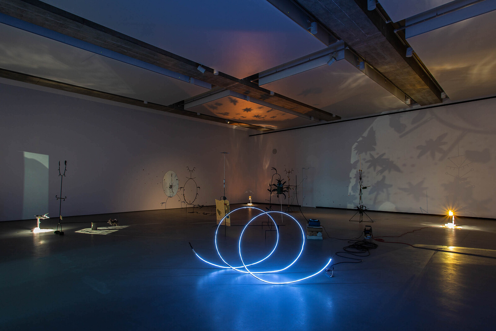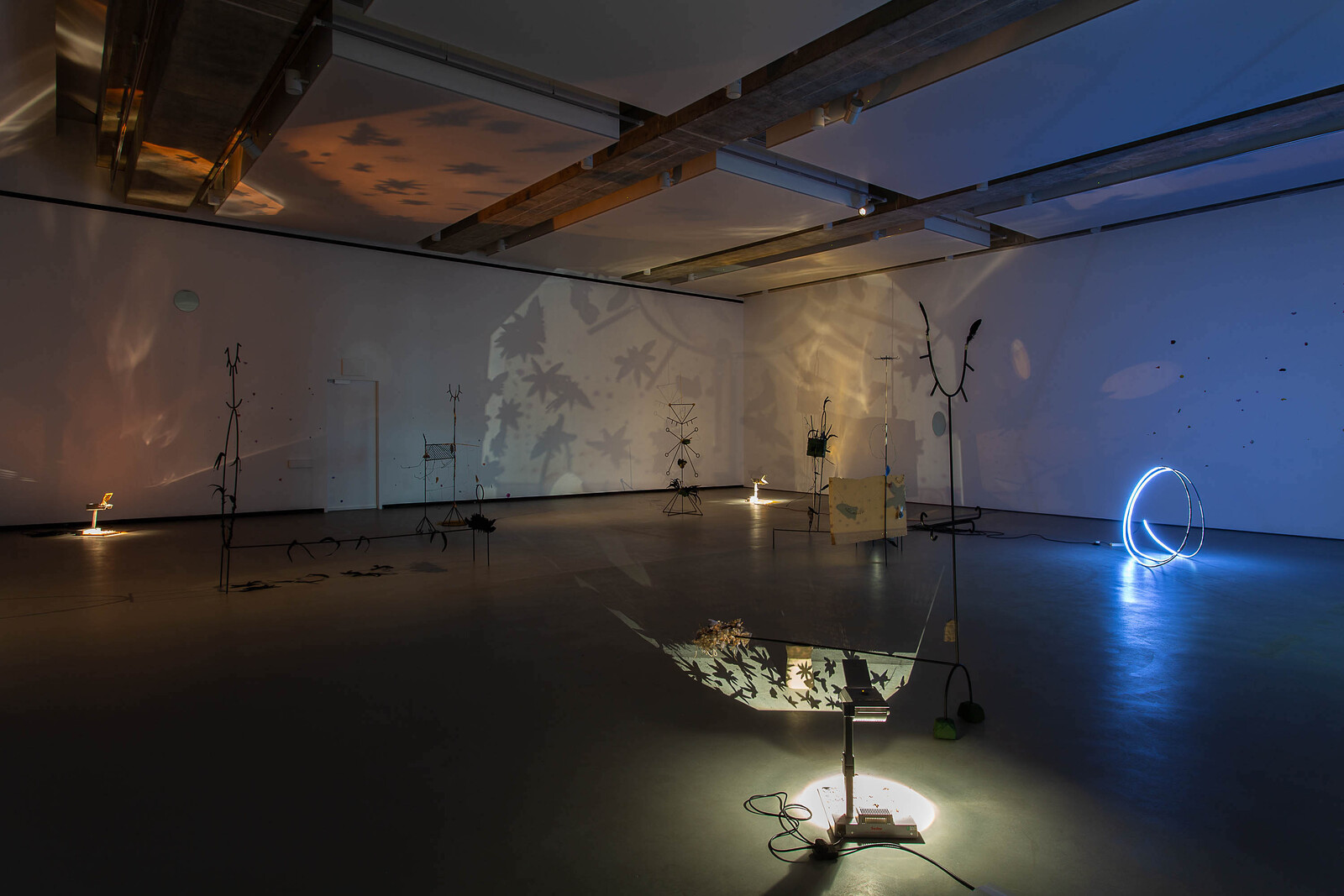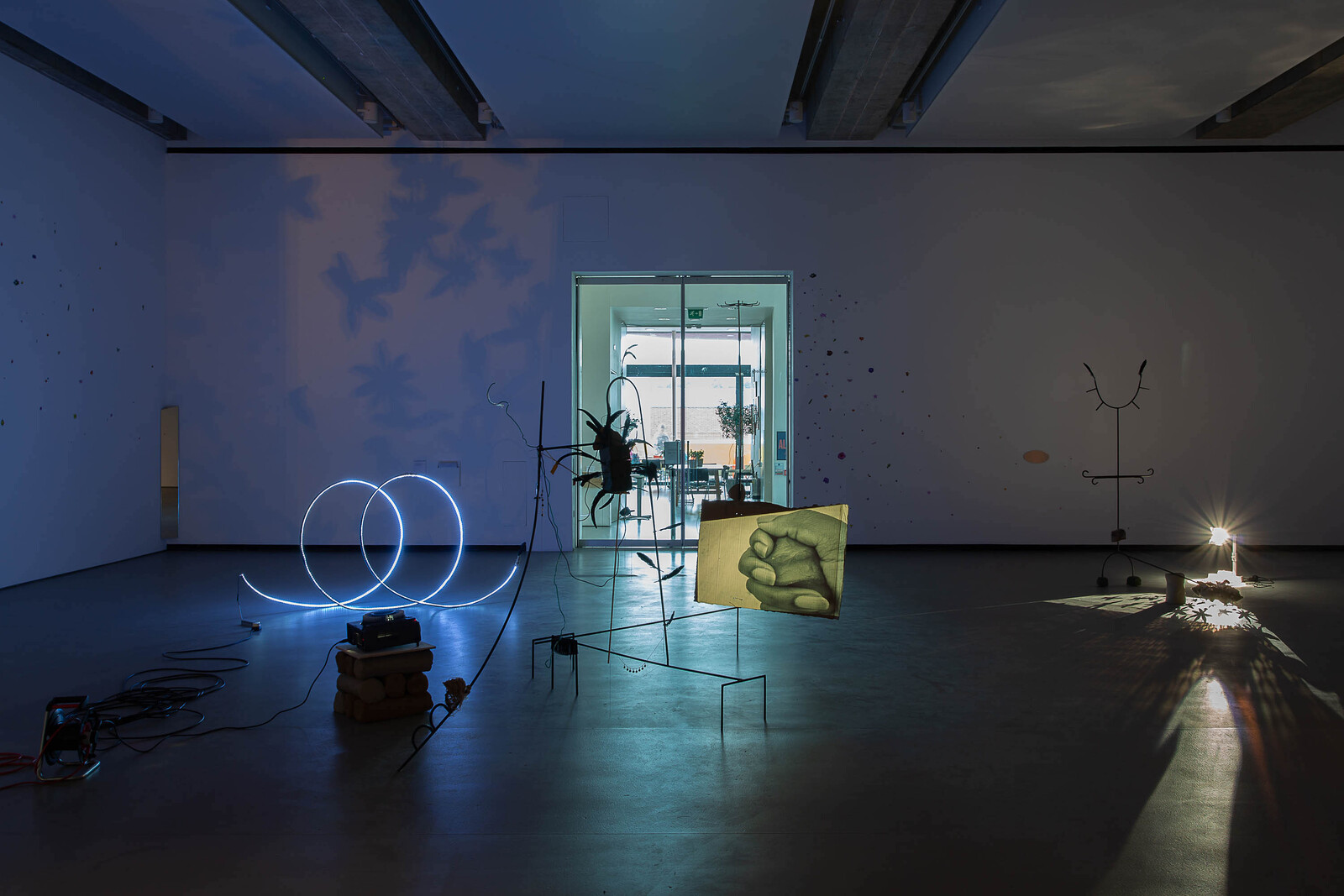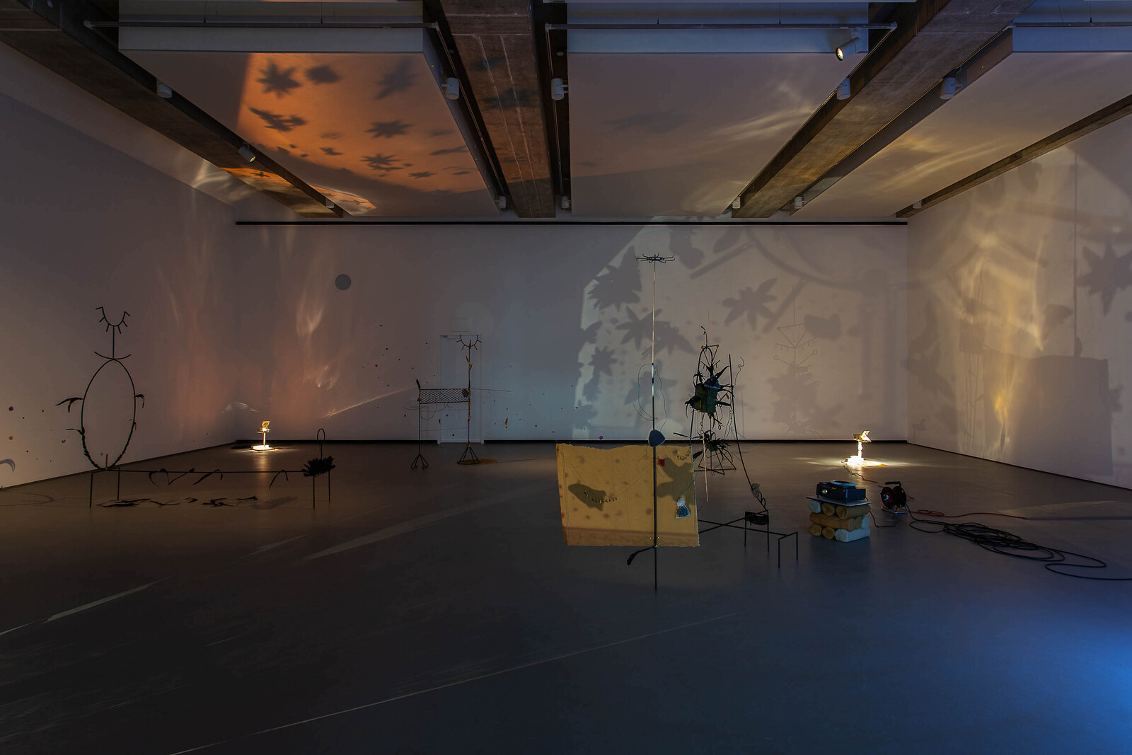 The darkened installation is punctuated by bursts of light emitted from overhead projectors placed on the floor. Star anise are scattered on their surfaces, their shadows cast upon the walls and across the ceiling. Soil—a significant material in Bopape’s work—features in a slideshow of images projected on a piece of cardboard at the center of the installation, showing close-up snapshots of a hand molding dirt and clay. Earth, in this instance, doubles as a reference to burial and the colonial removal of land. The crow feathers heighten the mournful, contemplative atmosphere established by the installation’s dim light. In world lore and literature, crows can symbolize ill health and loss—omens of death—or be celebrated figures denoting transformation, rather than life’s end. That both interpretations are possible testifies to the complexity of Bopape’s imaginary. What may initially register as hopeful and transitory, freedom and flight, can switch to mourning or loss. The artist purposefully leaves the densely packed associations—healing, nature, cosmology, moving through individual, collective, and global scales—open to interpretation.
