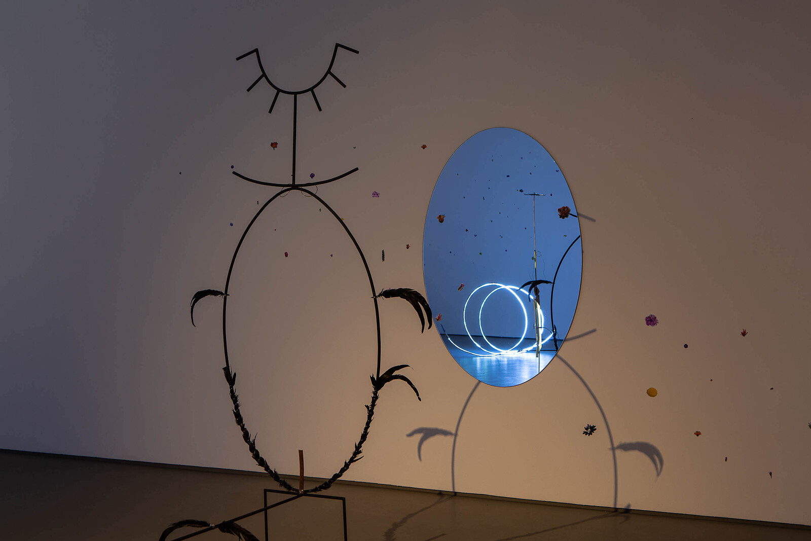 Six sculptures made from steel bars are adorned with crow’s feathers, medicinal herbs, spices, cut-out photographs of flowers and fruit, charm jewelry, bent copper wire, and green potters’ foam. The sculptures incorporate simple, geometric shapes such as ovals and triangles, amalgamating abstracted spiritual symbols drawn from cultures across the world. No information about these sources or materials is provided. As a result, understanding this exhibition can be a daunting challenge. Navigating the periphery of the installation, I was reminded of artists such as Laure Prouvost, Samara Scott, and Helen Marten, who collate found objects to forge ambiguous material lexicons. But while they draw upon the visual and material languages of western popular and consumer culture, Bopape references esoterism, spiritualism, and the African diaspora. The largest steel sculpture contains symbols that reference the sun and the moon alongside masculine and feminine motifs—an inverted pyramid, for example, doubles as a vulva. Considered in relation to the artist’s inclusion of herbs used to aid fertility, these suggest a cyclical model of birth and life.