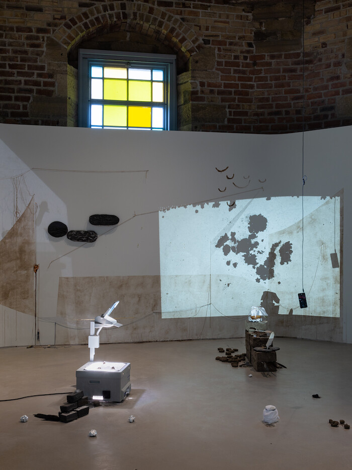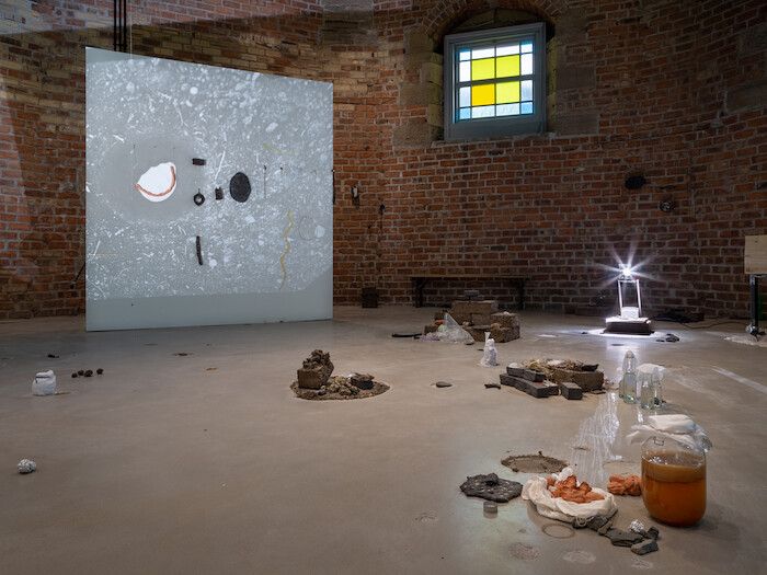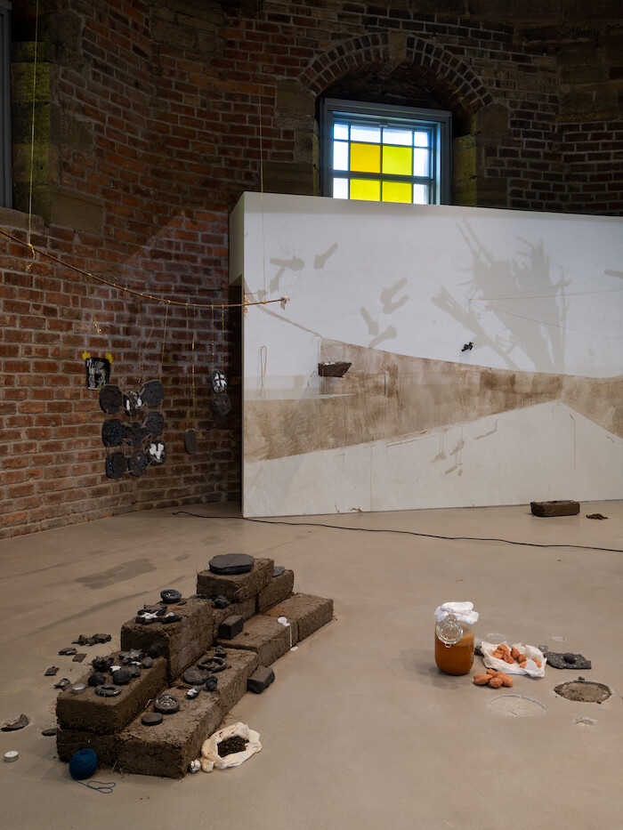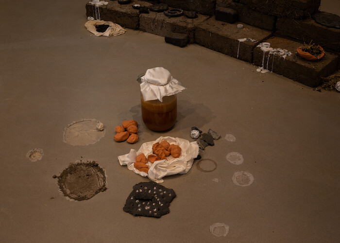 It feels at first like a place of ritual: there are candles, semi-precious stones, and the smell of incense. Bopape has made dozens of clay shapes, some like tiles, others formed by the clenching of a fist. Snowy owl feathers are tied to bowed branches that hang on golden thread from the high domed roof. And, befitting of an installation that took nine months to birth, there is also life: jars of kombucha. Echoing throughout is the rhythmic clattering of a slide projector. Sometimes there is a jangle of recorded bells.