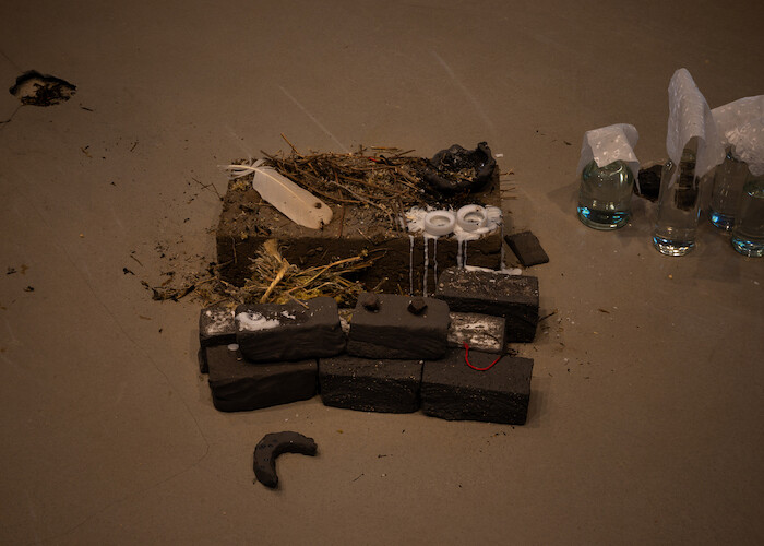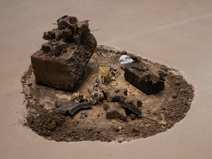 At once named and unnamable, Dineo Seshee Bopape’s installation 〰️ gathers myriad references (astrology, classical sculpture, Afrodiasporic spiritual practices, the Anthropocene) and materials (soil and rocks, satin and spices, glass and plastic, charcoal, jute, feathers, clay). It weaves them together thrillingly, with gold wire, cotton thread, and lines scraped into the concrete floor. In scale, the installation oscillates from tiny holes made by drawing pins to the vastness of a universe. Seen as a single entity, this is a work that marks itself, maps itself, archives its own making and its own meanings. It is a work that prompts a pile-up of words and renders them all inadequate. All my notes are lists.