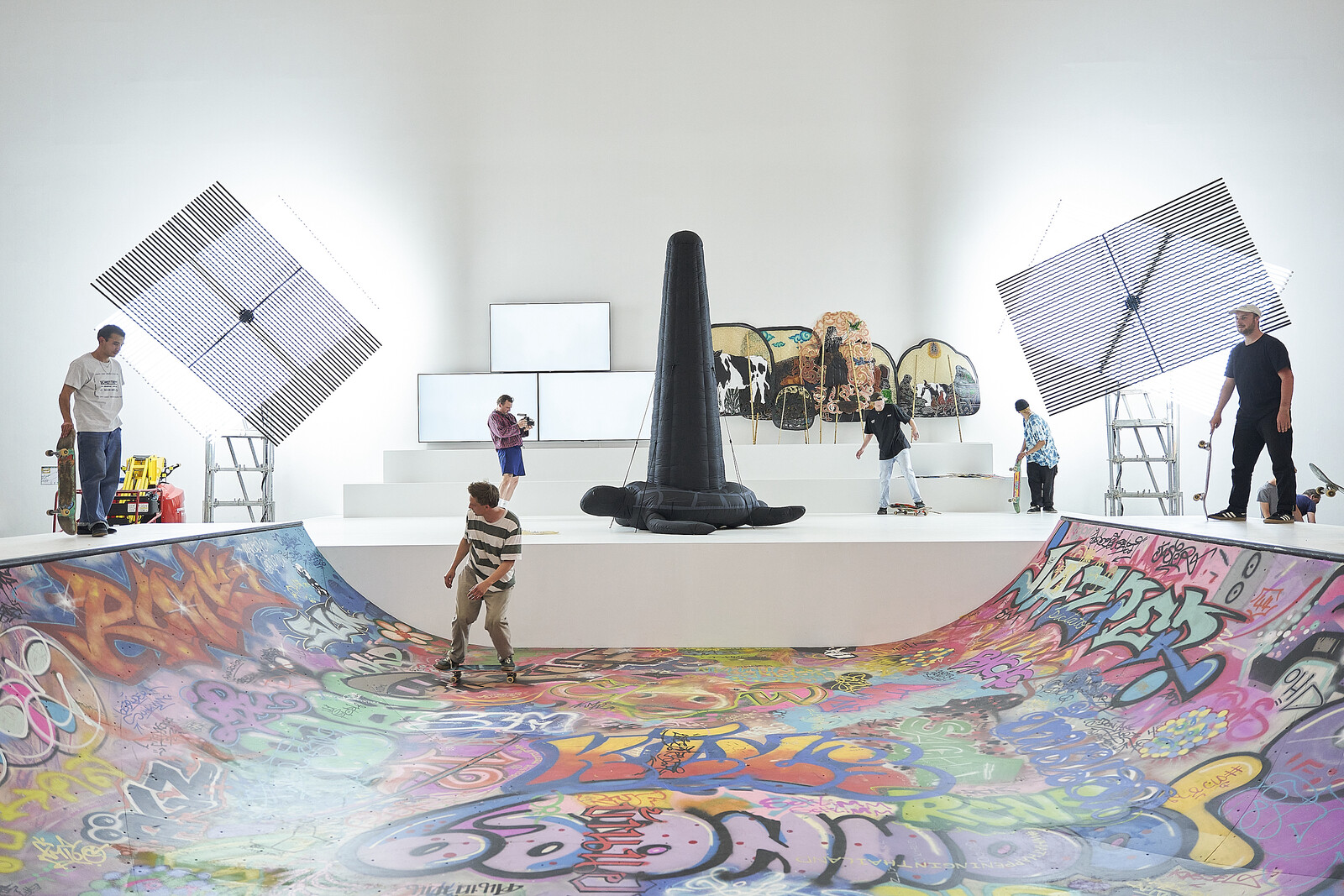 It is striking how many exhibition sites are populated with temporary structures: Baan Noorg Collaborative Arts & Culture’s skate ramp, *foundationClass* collective’s lecture hall, El-Warcha’s DIY workshop, Richard Bell’s Tent Embassy (2013-present), Centre d’art Waza’s display plinths and seating spaces. They come across as a parade of institutional prototypes, existing, for now, in the sheltered spaces of the museum, the gallery or—at a stretch—in the equally protected boundaries of the outdoor site specific installation. In their handbook, ruangrupa write that most of the invited collectives “come from contexts in which the state had failed to support the development of infrastructure and a support system for art and culture.”4 Can collaboration transform these models into the infrastructures these artists need? Is a quinquennial exhibition a means to redistribute the resources that will make such infrastructures possible? These are the questions ruangrupa are trying to answer in the game they are playing with Documenta and its audiences.