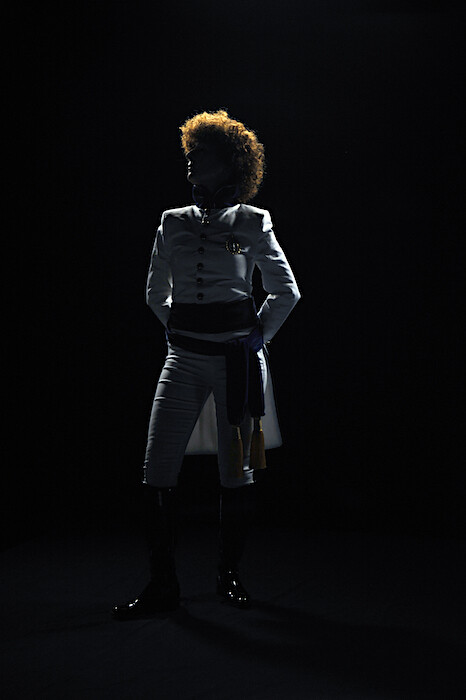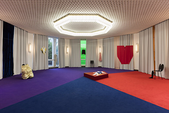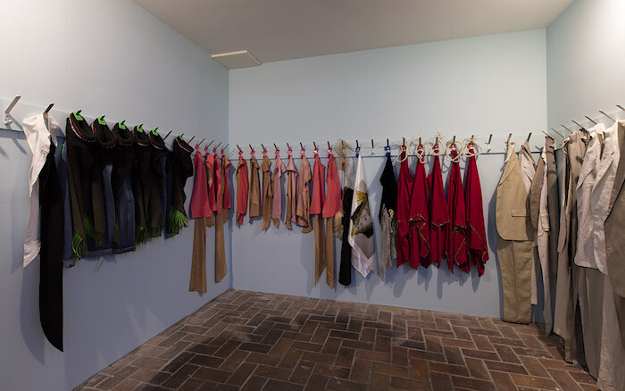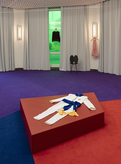 Dominique Gonzalez-Foerster first put herself literally in the shoes of such people as Scarlett O’Hara or Edgar Allen Poe in 2012. As part of the “Memory Marathon” at the Serpentine Gallery, she introduced well-known characters from the nineteenth and twentieth centuries and engaged them in a discussion about the status of opera in our present times. Subsequent versions of M. 2062 were played out across different locations, of which M. 20162 (The Boy with Green Hair) showed at the Irish Museum of Modern Art of Dublin, in June 2013, and M. 2062 (Edgar Allan Poe) at the Palais de Tokyo, in December of the same year. Costumes from both performances are on display at the Schinkel Pavillon.