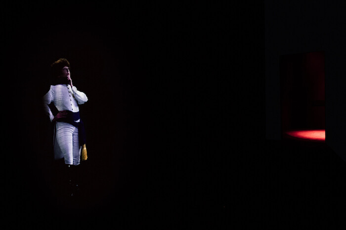 I heard a female voice singing an aria, but I had to pass by a life-sized moving image of a woman in a white uniform, fumbling my way along, before I fell over a rope that prevented me from reaching its source: an apparition of Maria Callas. A holographic illusion, to be more precise, of Dominique Gonzalez-Foerster playing Maria Callas: Opera (QM.15) (2016).