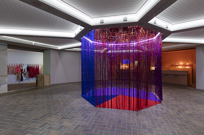 I don’t have a particular passion for being blindfolded. I hate ghosts, and I also hate costumes. A day before Halloween, Berlin’s Schinkel Pavillon organized an event for people who are, I guess, excited about these things: a costume party as part of an exhibition. Produced by the artist in collaboration with the Berlin fashion designers BLESS and design studio Manuel Raeder, “Costumes & Wishes for the 21st Century” could be considered an extension of the Esther Schipper show or vice versa. At Esther Schipper, Gonzalez-Foerster appears in three projections—in addition to the impersonation of Maria Callas, in Teatro (QM.15) (2016) the artist plays Sarah Bernhardt performing the Duke of Reichstadt, son of Napoleon, the lead role in Edmond Rostand’s 1900 drama L’Aiglon. In the third hologram, Cinema (QM.15) (2016), Gonzalez-Foerster dances like Marilyn Monroe in the 1961 film The Misfits, appearing, at least to my memory, alone in the countryside. At the Schinkel Pavillon, the clothes she was wearing for these roles—respectively a red robe, a white uniform, and a black dress—are laid out as art objects.