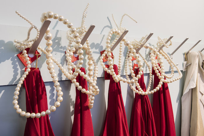 BLESS came up with “wearable fragments of a silhouette, inspired by the costumes worn by Gonzalez-Foester in her apparitions,” as described in the exhibition text. These garments hung in the gallery’s basement, and visitors could dress up in one-legged-jeans, or tie red robe-rags around themselves with a white pearl belt. If this was meant to present the opportunity to feel the spirit of the artist’s experience as Marilyn Monroe or Edgar Allan Poe—“to incorporate the characters,” the invitation read—it failed. It rather felt like a ride into the local contemporary fashion world that art doesn’t need. The clothes can be purchased, and in that respect, I would even call it a joyful marketing strategy. The lines between private gallery space and non-profit institutions, between commercial and non-commercial zones, are very blurry, and every time an exhibition opens we can engage in this discussion anew, especially when artists themselves emphasize the relationship between market and art and play it out aesthetically.