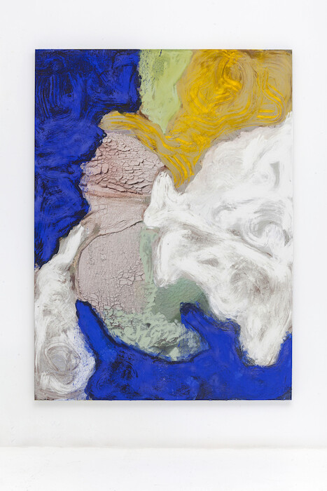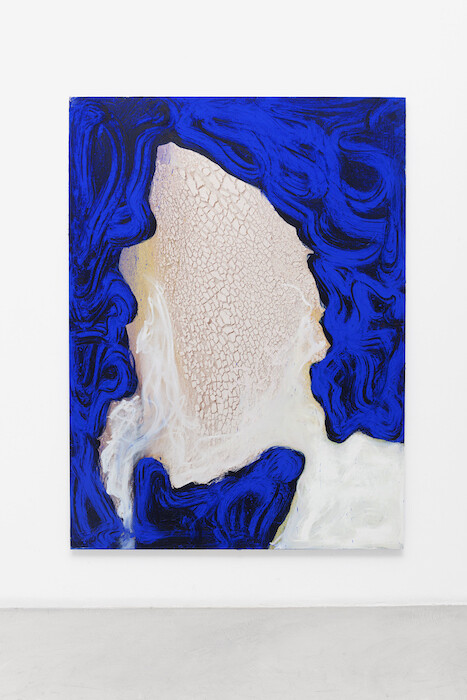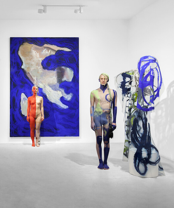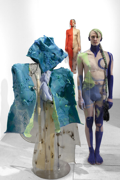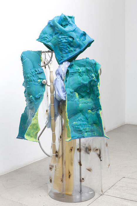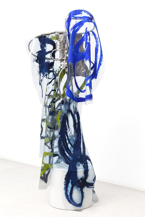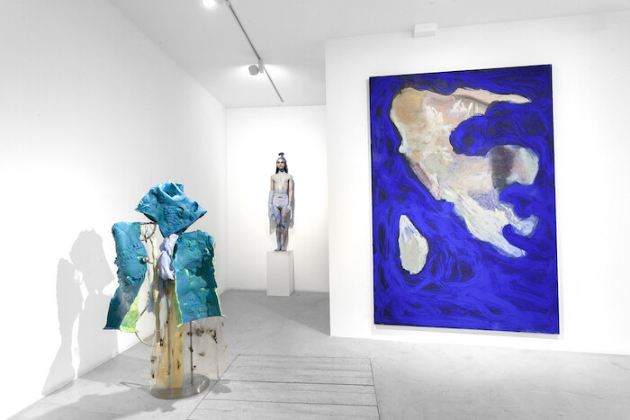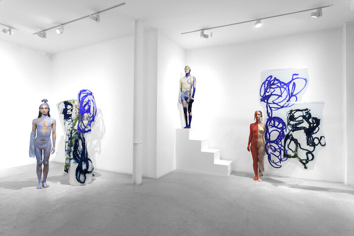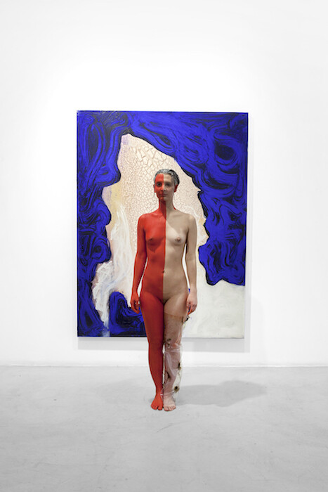 Last autumn, Huanca developed a performance-based commission at the Zabludowicz Collection in London that pushed these issues to the limit, developing performances that took place on a daily basis. The exhibition at Travesía Cuatro delves into this line of work on a smaller scale, generating a space where bodies, materials, and forms gather to establish an architecture of presence. The titles of the paintings, through which matter emerges as something between the natural and the artificial, and in which blue predominates over skin tones and earthy colors, allude to different types of rocks, minerals, and natural processes, such as Vaporize Rock (2016). The totemic sculptures, on the other hand, combine a variety of materials that relate to the body and which stand out for their tactile qualities, such as clothes, skin, silicone body imprints, natural and synthetic textiles, or re-contextualized cultural artifacts. Collaborators’ bodies are painted from head to toe, resembling figures halfway between a shaman and a futuristic raver. As they move through the space in a trance, following an icy choreography, they switch positions, climb up and down stairs and props that are scattered throughout the gallery, and engage with paintings and sculptures in a wordless dialogue. A poem, written by the artist and presented in the press release, once again alludes to the story of Bartolina Sisa—her dismembered body, her blood spilled over the earth, and the survival of her spirit and vitality. This is embodied, in the exhibition, by the constellation of warriors and goddesses, represented textures, scarred and burned skin, or ripped hair.