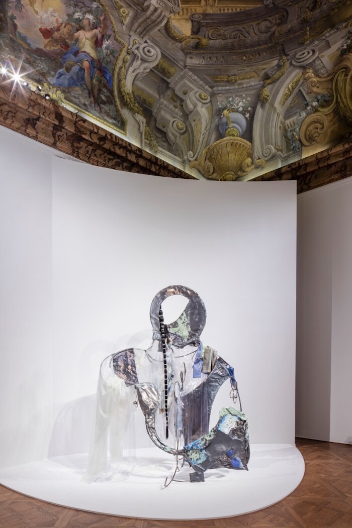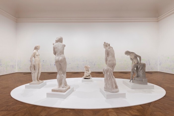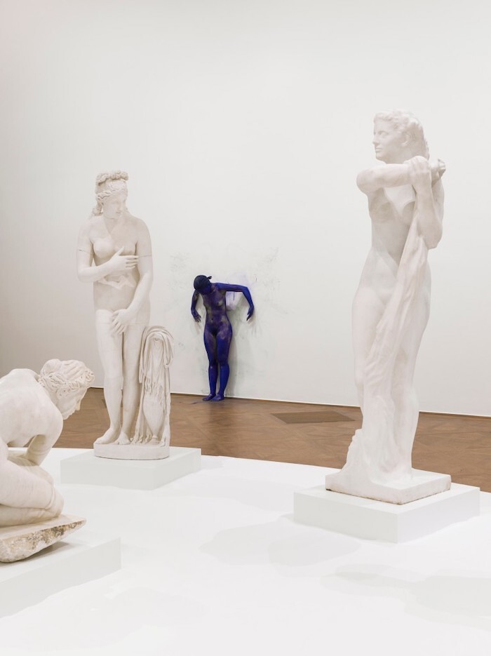 The final room, with its deep blue walls, draws viewers into another space of ritual. On each wall hang huge, swirling, Gustav Klimt-esque canvases—ten in total, mirroring the first room. Collectively titled “MAGMA,” these paintings in oil, acrylic, and blue pigment evoke a kind of atavistic, disfigured time against the frozen time of the classical statues. The smell of myrrh drifts across the room. Here, art is wrenched into the space of myth, yet this move is countered by the large mixed-media sculptures displayed in front of the paintings, which absorb the new through their materials. In this warm, scented room is a model, guarded by white-clad invigilators, sitting still. They are painted blue and white, divided in sharp lines down the middle of the torso; they move sideways, becoming almost invisible as their blue blends with that of the wall.