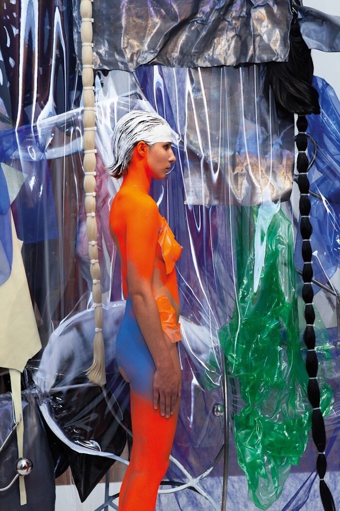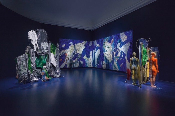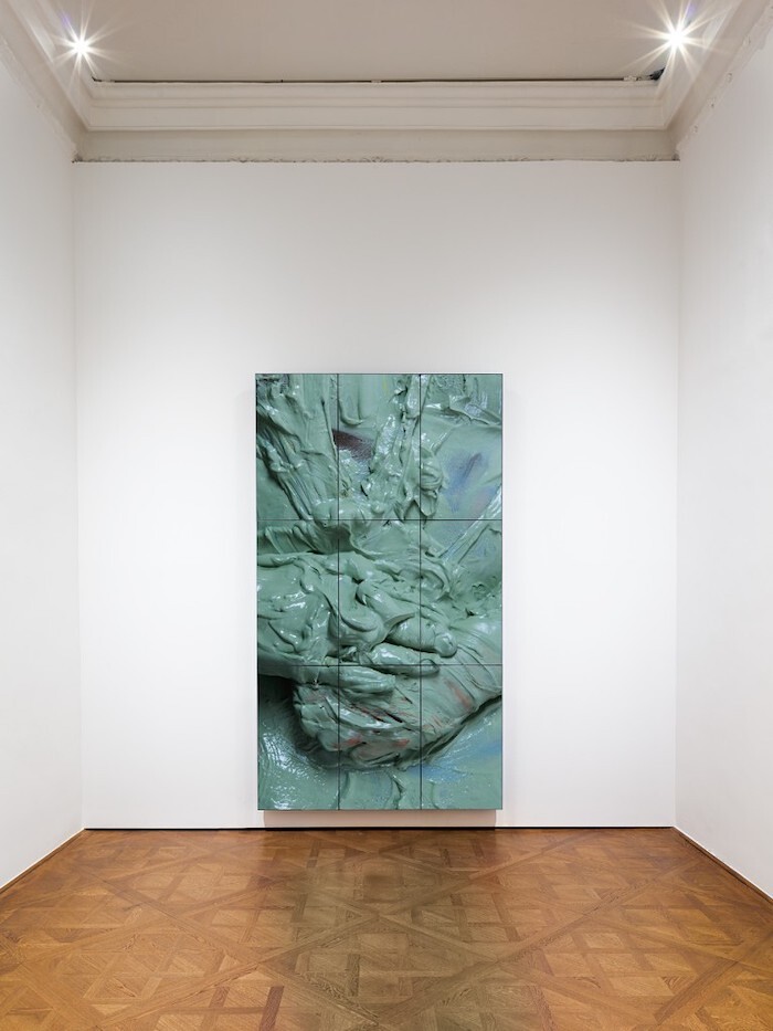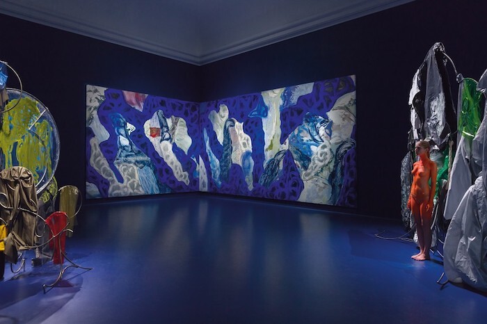 Flatness, surface, posture, and the notion of cycles animate Donna Huanca’s “Piedra Quemada” [Scorched Stone]. The exhibition, displayed across Vienna’s Lower Belvedere museum, is a Gesamtkunstwerk consisting of 33 works including paintings, mixed-media sculptures, and live models whose bodies, painted by the artist with bright colors, move slowly throughout the space. In the first room, blue, green, white, and pink oil and acrylic paints billow across ten canvases. The paintings’ titles (all works 2018) point to forms of containment, growth, process, and sedimentation, as in MOULD, CYANOBACTERIA (bacteria which gain energy through photosynthesis), and ACRITARCH (an organic microfossil believed to be up to 1400 million years old).
