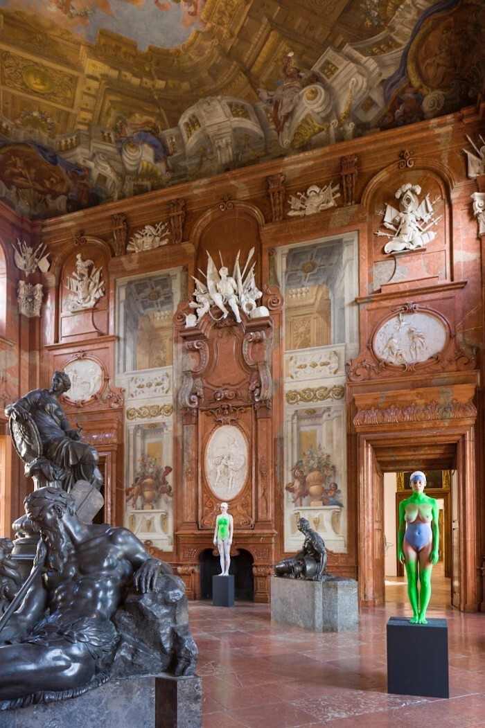 Built during the early eighteenth century as the palace of Prince Eugene of Savoy (1663–1736), in 1903 the Lower Belvedere was adapted from a place of aristocratic and imperial absolutism to a space for secularized art exhibitions. The sound installation TECO Y ZENON (PARENTS SPEAKING) plays in the Baroque Marble Gallery. Its ceiling features a fresco of Apollo riding a sun chariot and sculptures of Providentia. Personifications of Vienna’s four main rivers fill the floor and statues of ankle-shackled prisoners adorn the walls. Intimate conversations between the artist’s parents, during which her father and mother discuss Quechua, echo around this space of pre-conditioned ritual.