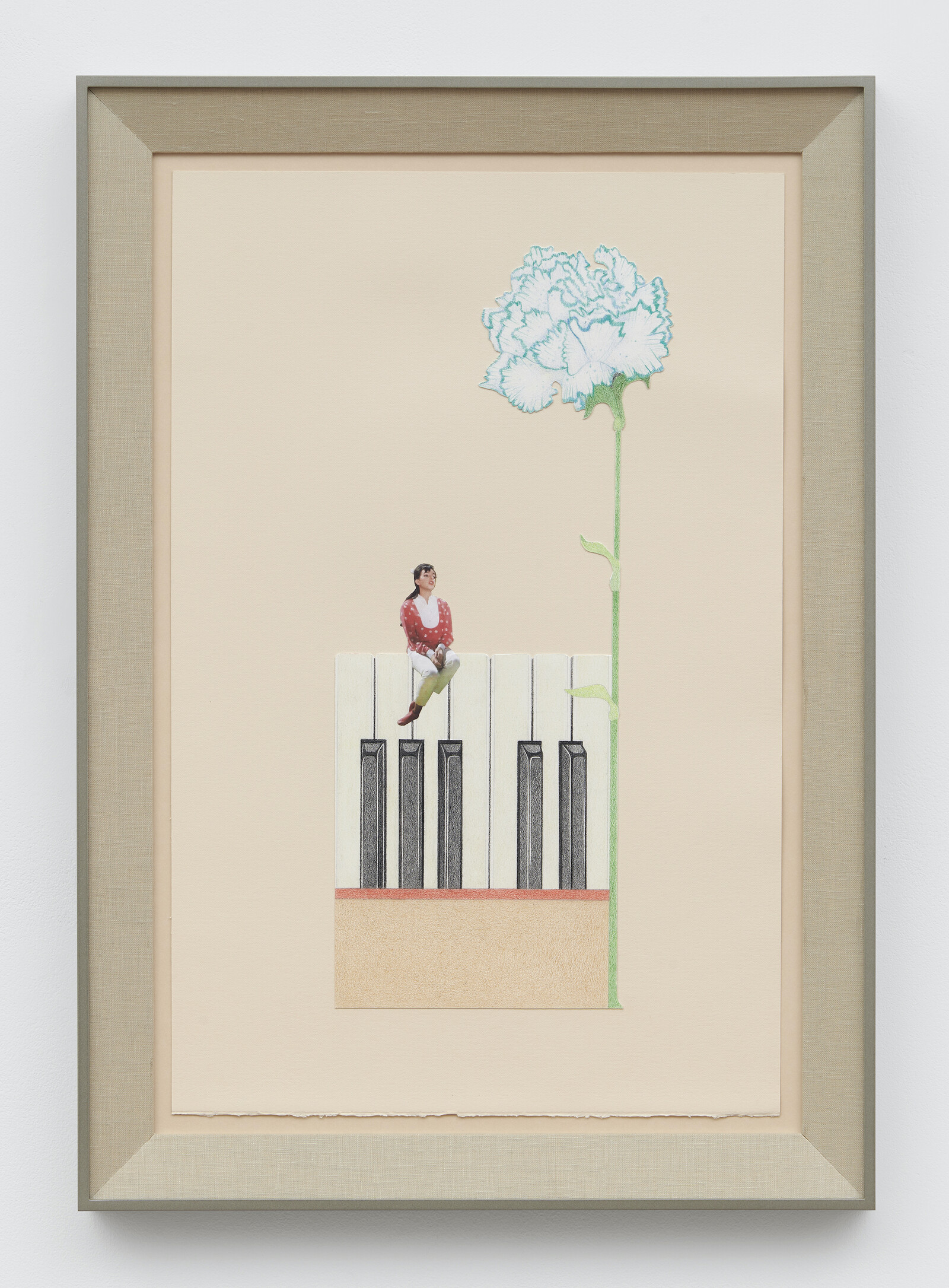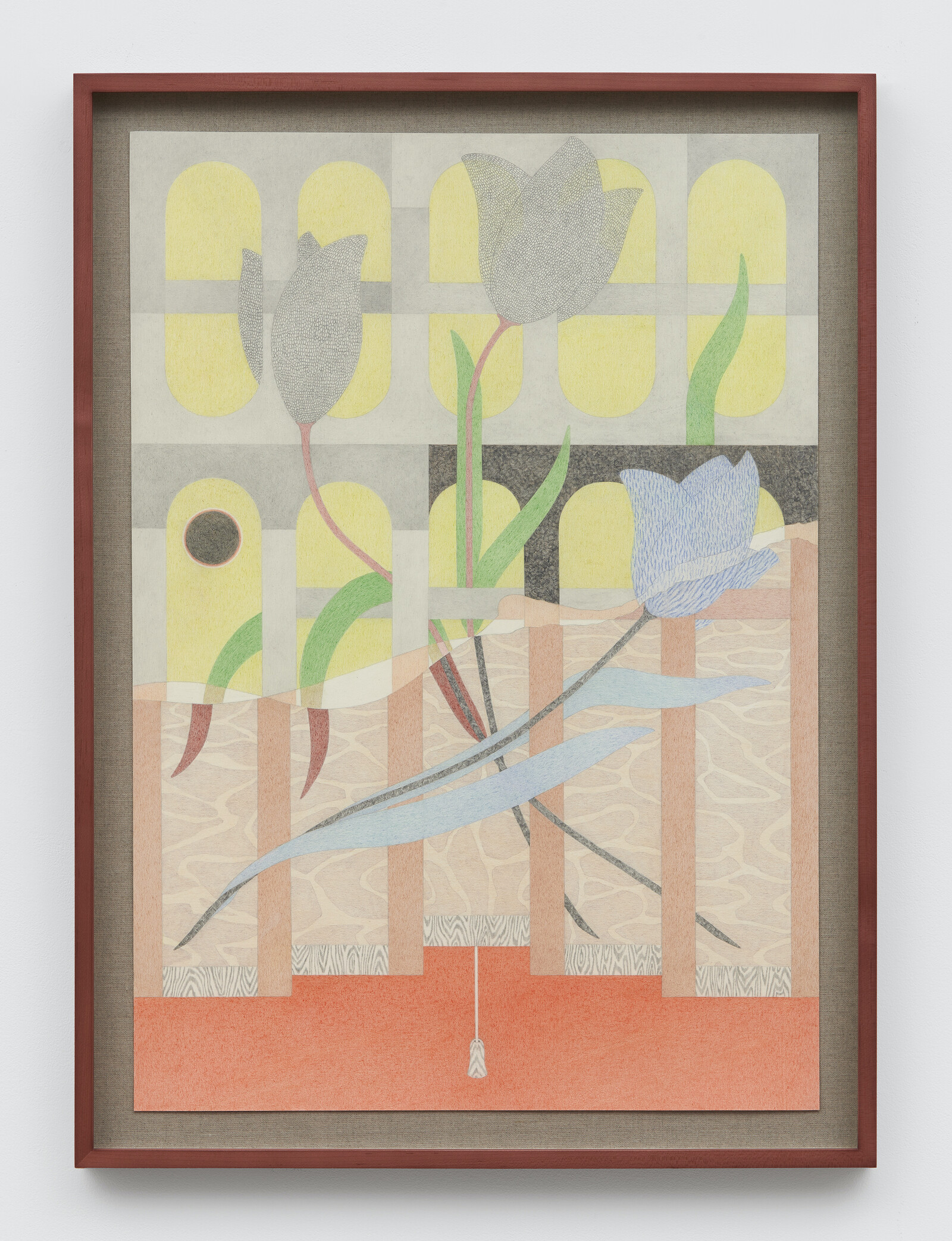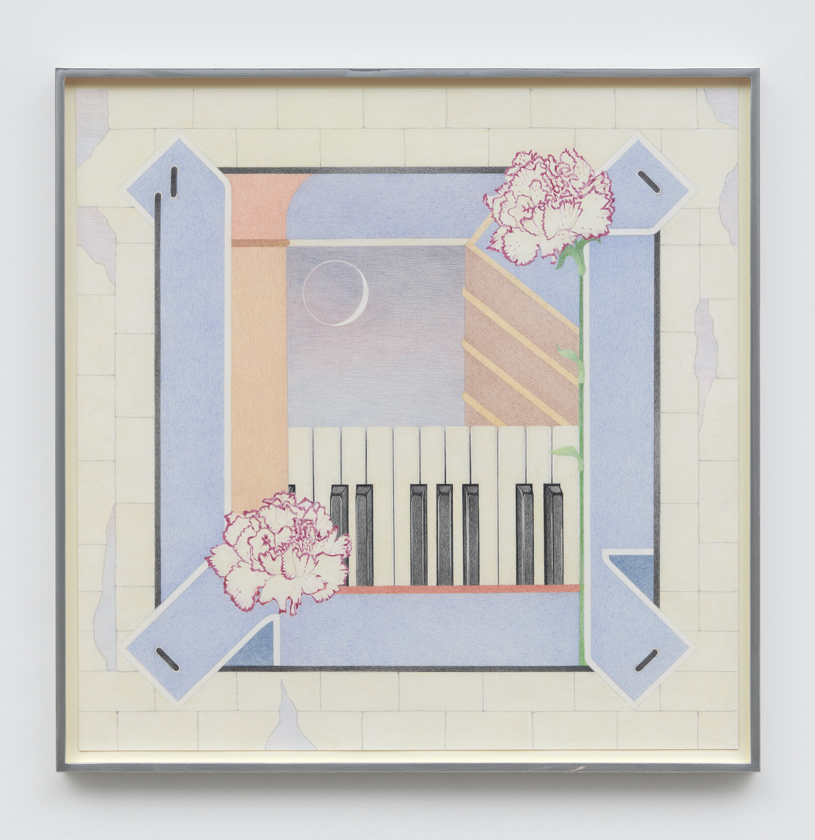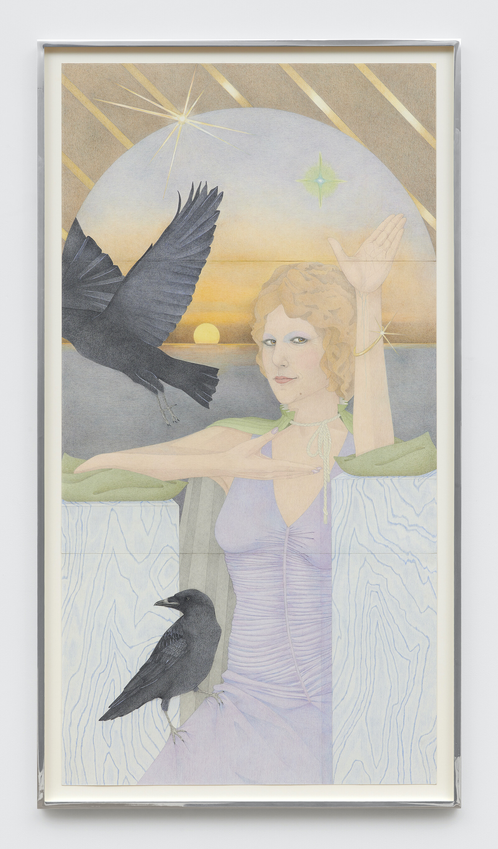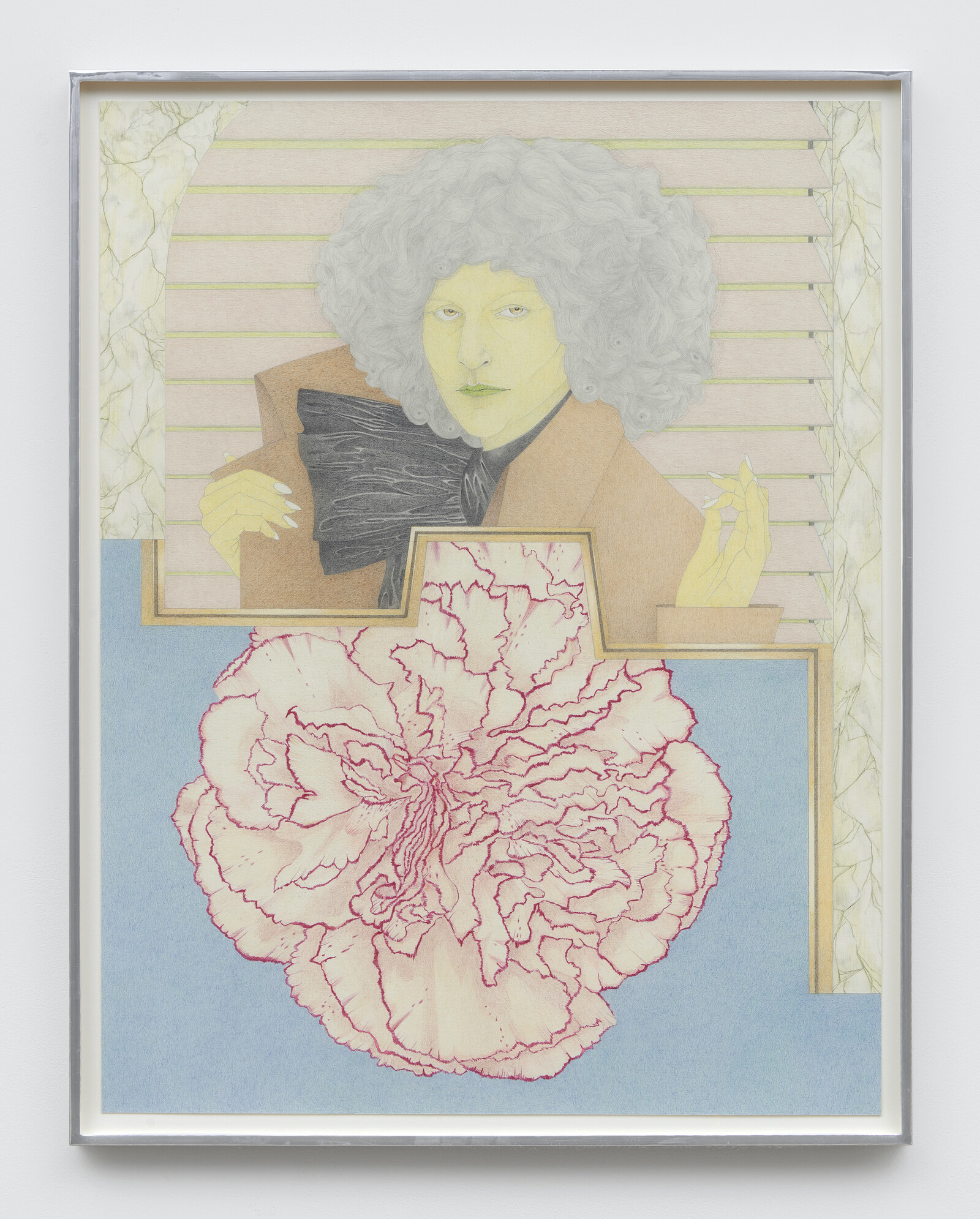 Several pieces show the artist herself, roughly life-size, donning various glamorous disguises: slinky, ruched dresses with plunging necklines; ruffled poet’s blouses under tailored camel coats; immaculately coiffed wigs. She slips from frame to frame like a woman on the run. Most are rendered entirely in Caran d’Ache pencil, a painstakingly slow process and unforgiving material which lends itself naturally to the artist’s taste for minute detail against flat, overlapping planes and tightly choreographed mise-en-scene. Blocks of color are lightly flecked with the pencils’ grain like slub in raw silk. Each field is charged with the directionality of a small, sharp point; each mark’s density of pigment records the weight of the hand which made it.
