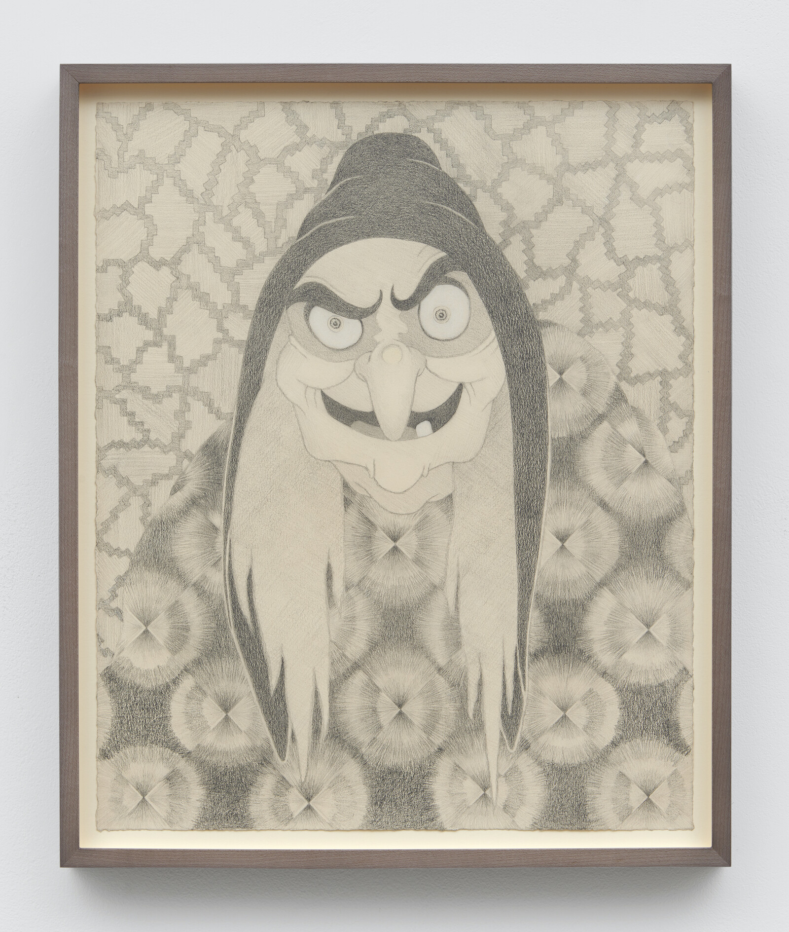 The campy, glamorous allure of spellcasting and enchantment is central to the logic which binds the works of “In Person”; the ease with which disparate elements hang together. Tucked in a nook between the gallery office and a flight of steps, a compact, monochrome portrait of the Evil Queen from 1937’s Snow White (aptly named Hag) charms, despite my growing sense of witch-art fatigue (watch out, mushrooms—you’re next). Against the clean Disney lines of her grinning face—all arched eyebrows, boils and sagging cheeks—the old crone’s cloak is made up of a repeated geometric pattern somewhere between a 1970s wallpaper and a magic eye puzzle.