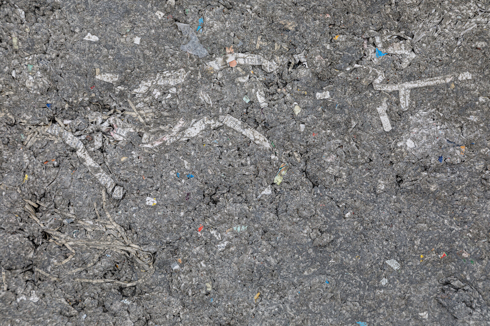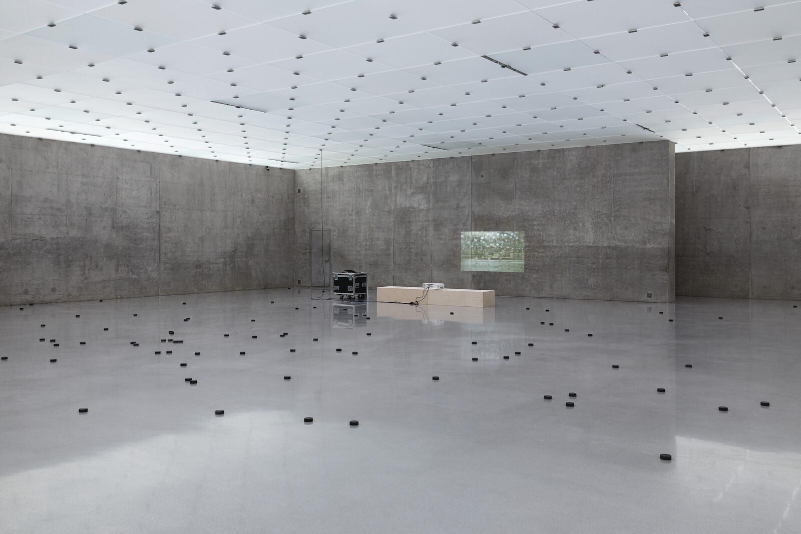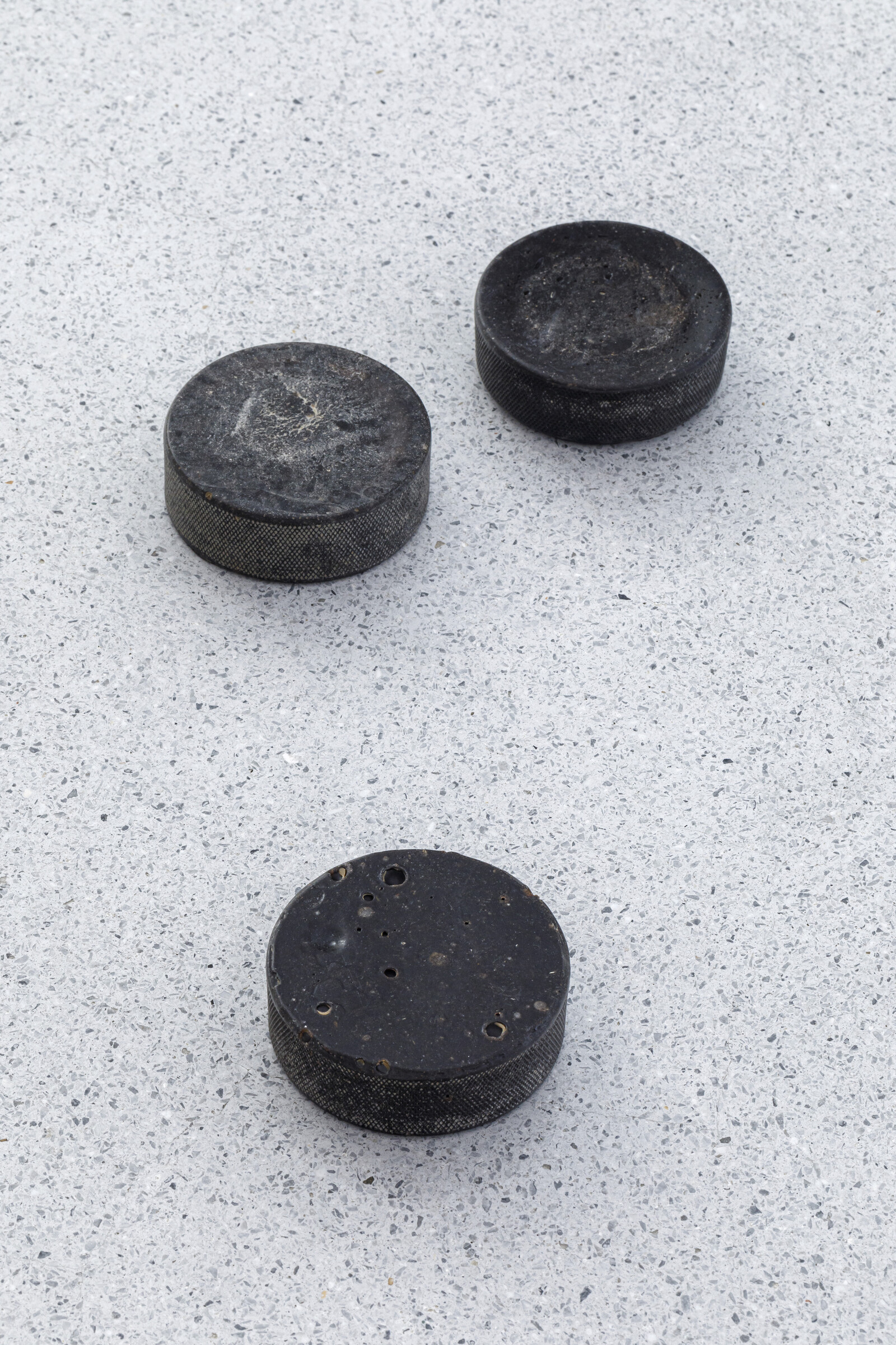 The building has been infiltrated by materials brought from her site of production, a normal form of exhibition, but articulated here. The papercrete is from shredded Berlin office waste. A collection of not-quite explicable casting moulds found in the same city, each about the size of a torso, makes the work 27 Male Molds (2021) arranged in a cluster. A similar form appears in Shell Which Fell Without Exploding (2021), a photograph reproduced from the British World War One magazine The Illustrated War News showing an Austrian shell, like a giant bullet, that once landed “blind” in Italian trenches. An Italian soldier poses beside it to show its size: two bodies lie side by side, one would-be victim, one concentrated violence, almost embracing. And for further intensity, the floor on the second story is dotted with Pucks (bagarreurs) (2021), dull, dark pucks made from used coffee grounds from the bistro in the next-door administration building. In something close to symbolic overload they reference both aggressive, flying (sporting) artillery and leisure. They also return waste into a use cycle, as well as highlight how the Kunsthaus Bregenz’s design removed various museum building functions from the site of exhibition.