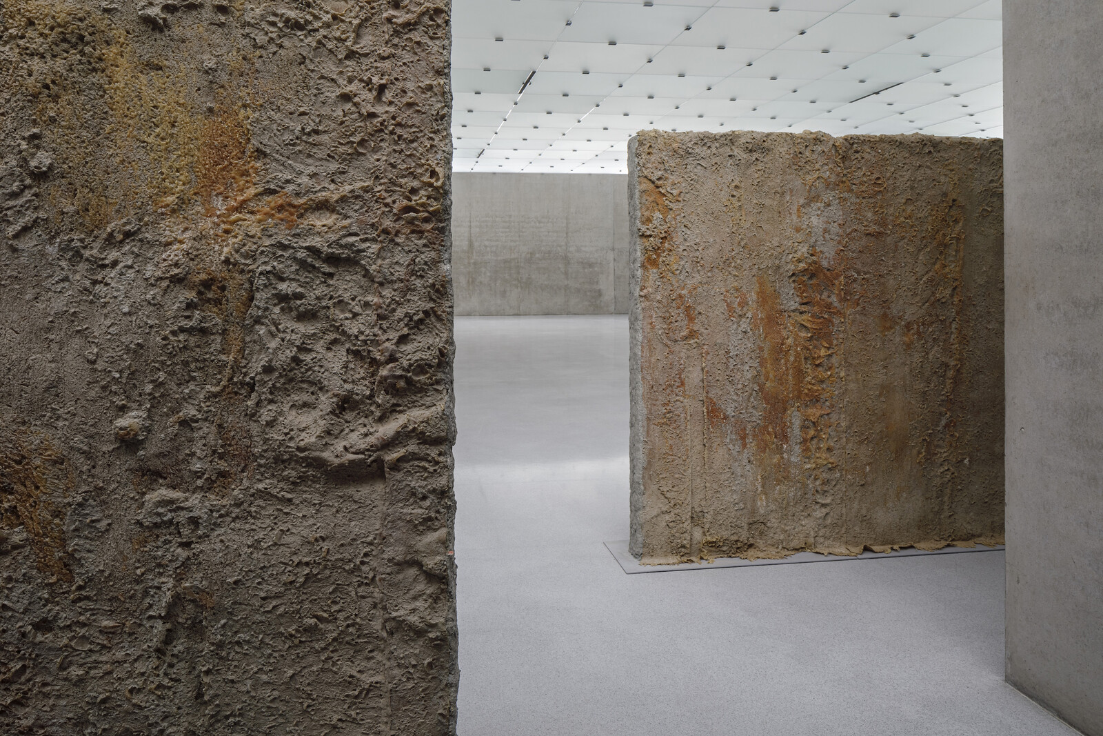 But Budor, who trained as an architect, creeps into the interstices and explores the tissues of this building that would like to disappear. Her exhibition really kicks off on the first story, where the entrance is at first blocked by a wall, its rust-coloured latex skin supported by a papercrete construction. Walk around it and a constellation of such structures, Kollektorgang (I-XIV, XV-XXIV and XXV-XXIX) (all 2021), marking corners becomes evident, set in from the gallery walls at a meter or two’s distance, latex of various textures on the outer side, gray paper mud facing into the space. Budor has been into the substructure of the building, the service duct with so-called diaphragm walls that protect the Kunsthaus structure from its immediate context—Lake Constance—where water seeping in is pumped away. Now, positioned as far within gallery walls as the tunnel below is outside them, the structures are casts of the tunnel surfaces and make an additional filter for viewers to pass through.