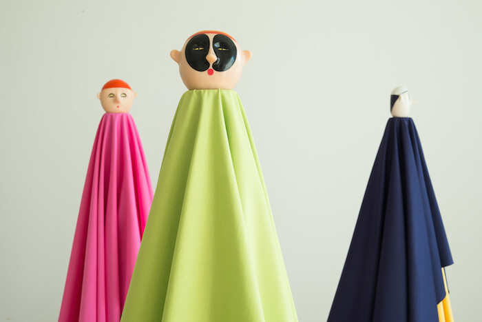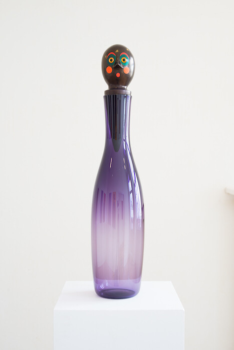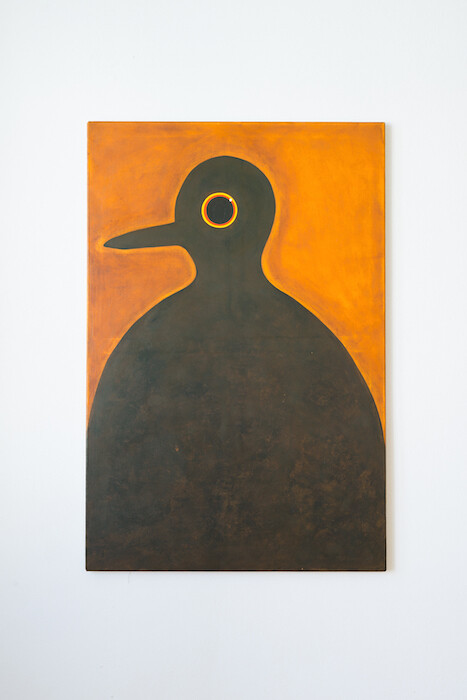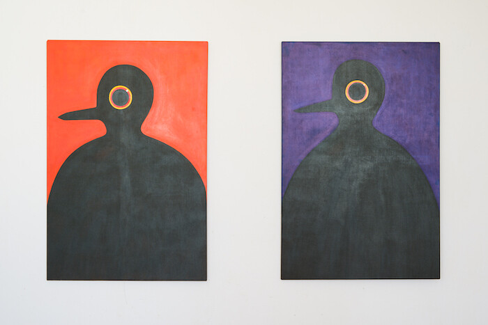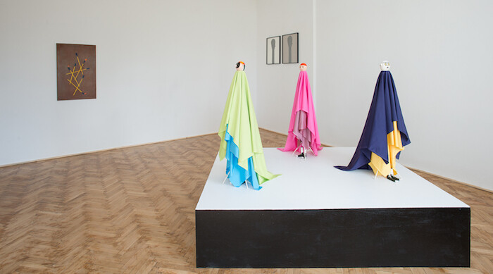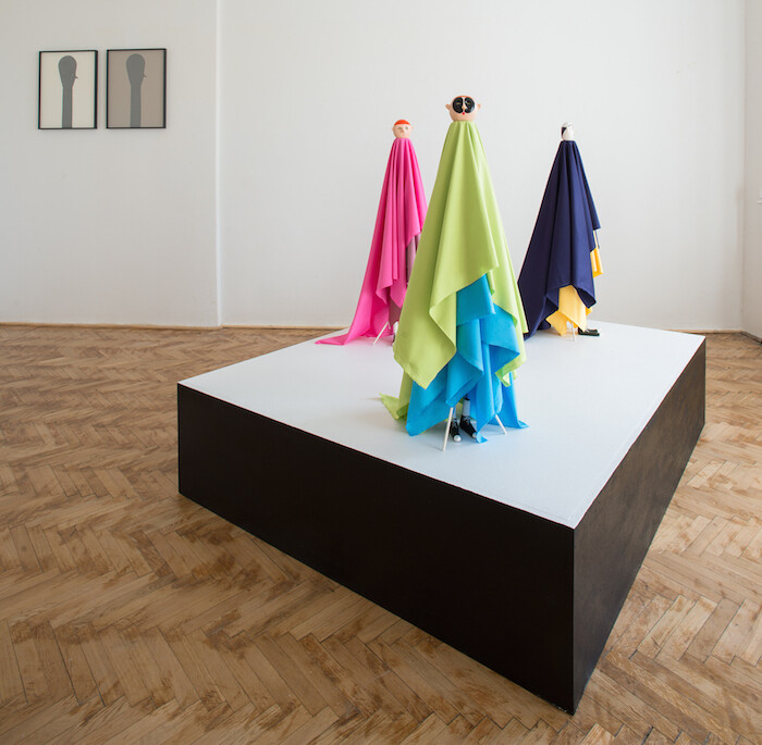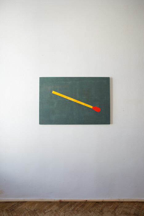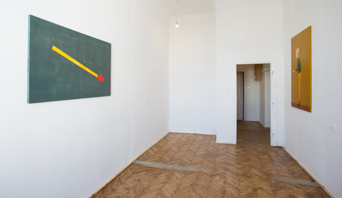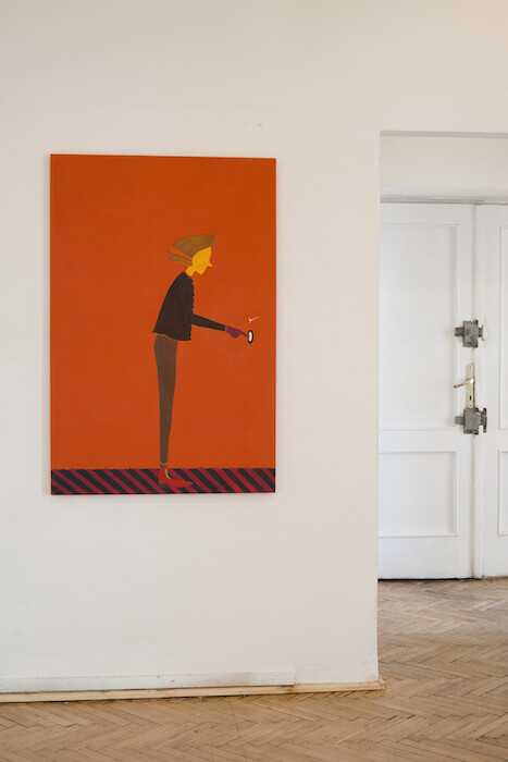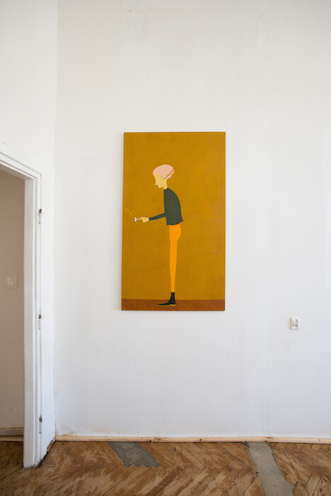 Polish-born artist Dorota Jurczak’s characters also seem to belong to a gentler world, which, somewhat paradoxically, is also more somber than ours. In her paintings exhibited at Galeria Piktogram, two of the artist’s slender and demure figures ring the buzzer: Bzzz and Bzzz Bzzz (both 2013). No Bzzz Bzzz Bzzz, as that would seem a tad compulsive. Besides, no matter how much they rang, the door would never be opened: none of the remaining protagonists in Jurczak’s paintings and sculptures have any arms! untitled (Schmuko), untitled (Jevi), and untitled (Sib)––all from 2015–– seem unfazed; Jevi looks circumspect, Sib slightly passive, and Schmuko somewhat aloof––more gatekeepers than a welcoming committee. Only Ludwik 6 (2015) is apparently alarmed, though there’s not much he can do: his body is a bottle, so whatever happens he won’t be able to flee. As for the clamor of rook-men who seem to perch overhead––Brahma, Brahma I, Brahma II, Brahma III, and Brahma IV (2014-15) and the ill-fated matchstick-men, all called Zapalki (2014-15)––we have no way of knowing, based on their expression, if they can hear you.