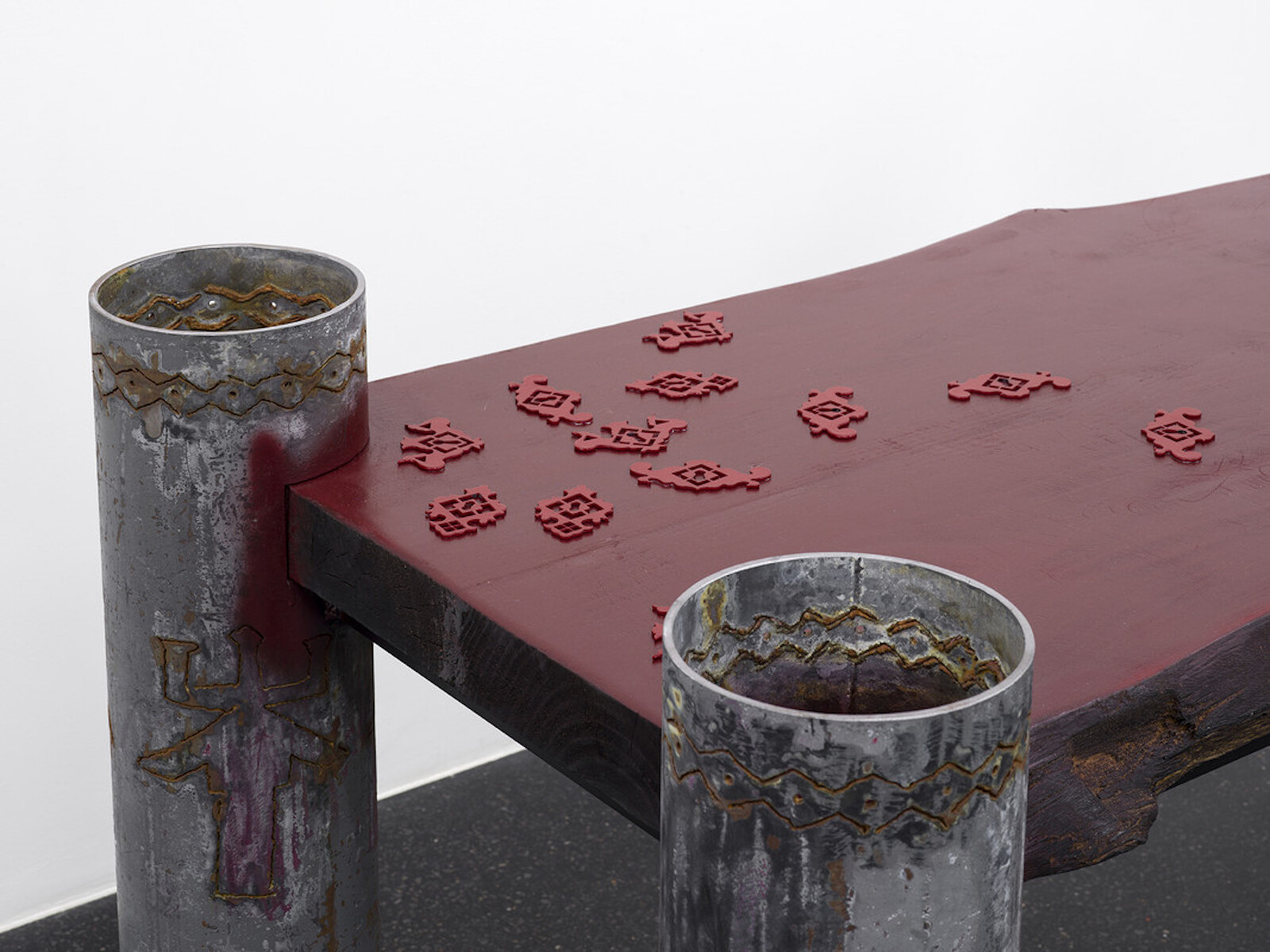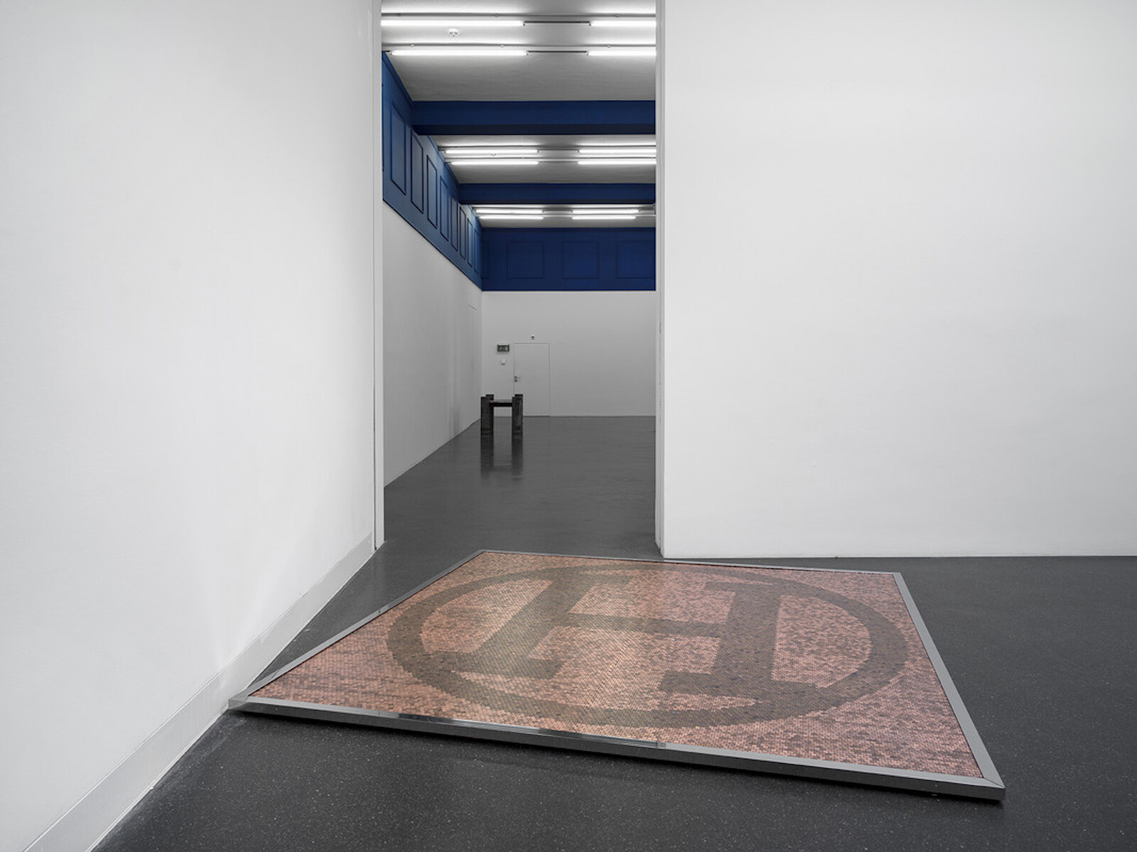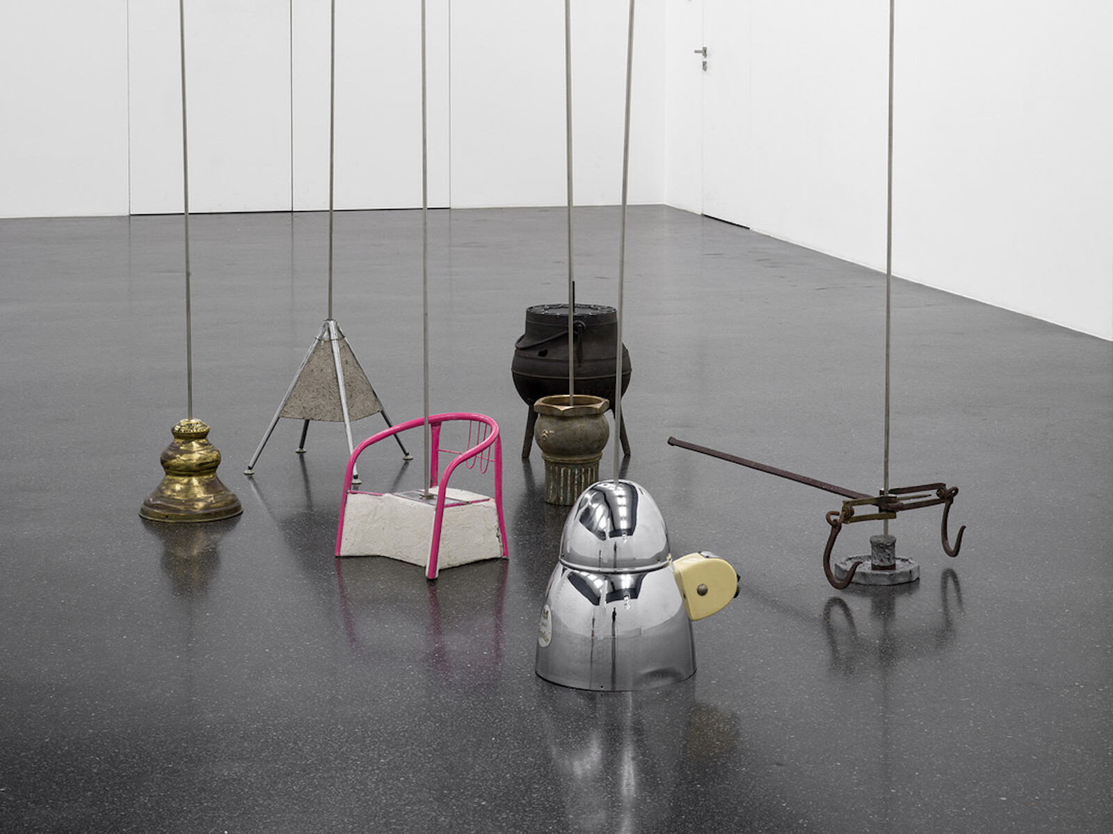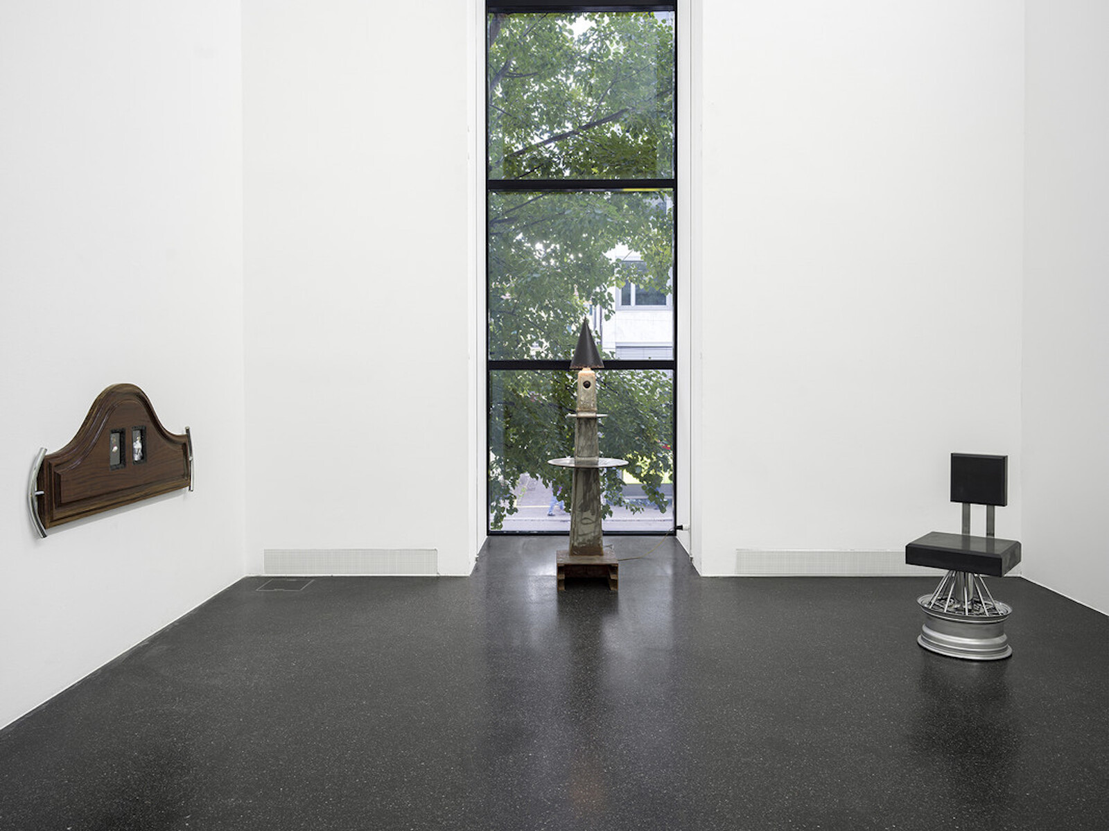 Though from Texas, Kanu now makes his ambiguous objects in a studio in rural Portugal. The influence can be seen in the selection of decorative Portuguese keyhole plates painted onto the wooden tabletop of aro pillars chukwu dinners, which is supported by thick metal pipes. Deep blue panelling collars the ceiling, rather than the base, of the central gallery: General State of Judgement and Concern. Its velvety hue is a pleasing touch, making the space a little cosier, and easier to imagine these objects in a living room. The patina on the tortured metal sheet in the light fitting Explosion Proof is so appealing—was there an explosion or is it to signify antiquity, accelerated for your convenience? It’s not all to my taste though. Chair [ iii ] (Dark), a poured concrete seat on top of a shiny car rim, is a bit too car culture, too overtly “masculine.”