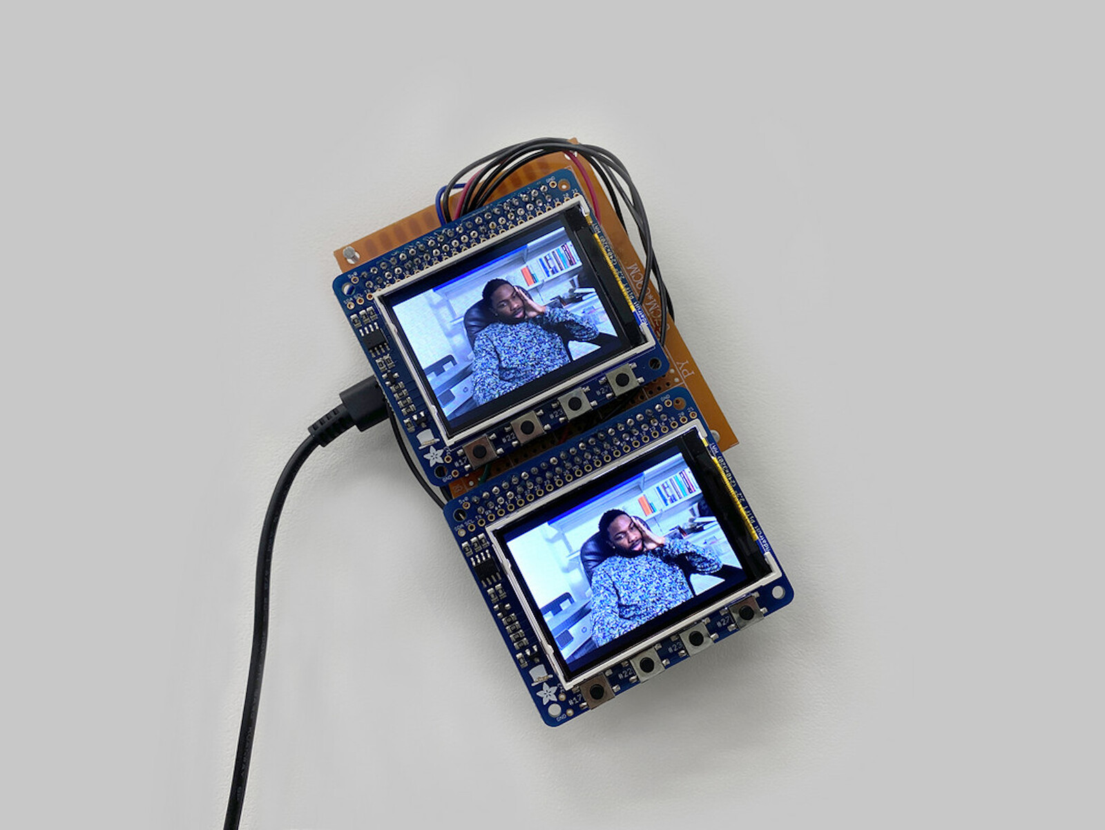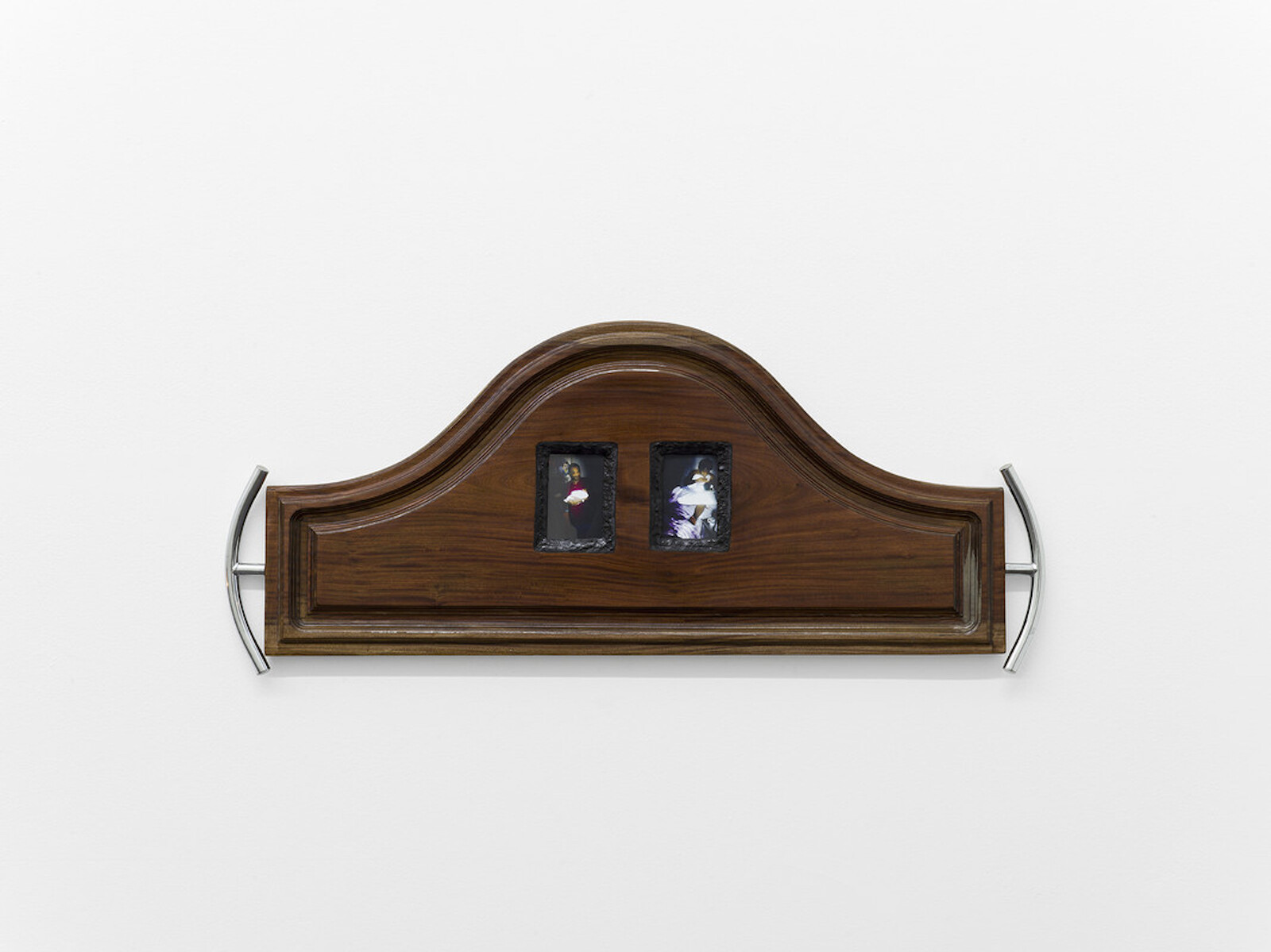 Kanu’s titles often give a strong steer, though they don’t entirely guide the viewer. The helipad (unresolved design marathon dance continua [Hermès, Houston])? I should have danced across it, not skirted it. Amid the collection of objects that seem to operate through generic resonance or symbolism are autobiographical elements that refer to Kanu’s Nigerian heritage: the wooden Headboard (Love Crime) with foreign handles added on either side, into which are inlaid the first pictures of the artist with his father and mother respectively. And on a small Raspberry Pi display tacked askew to the wall in a far corner plays youtu.be/vrqLrxWUBXc (the title a link to watch online what’s scarcely visible in the gallery). It’s a messy video collage of hand-held phone footage and documentary, sandwiched between colour bands: kids in a car at night, a gathering of Nigerian elders, Nancy Pelosi kneeling, the young Travis Scott (a friend) in his bedroom studio, parties, sheep being herded past a car, and the artist seen on his webcam.