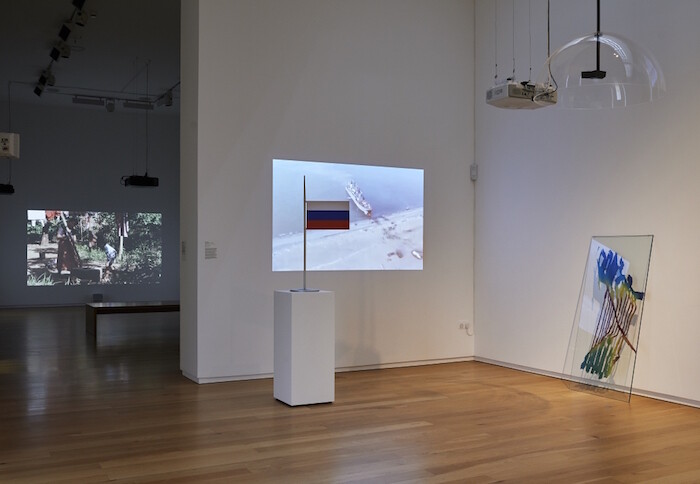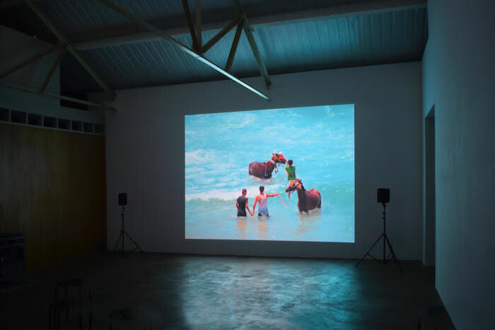 These gloomy thoughts were not dispelled by “The Ocean after Nature” at the Hugh Lane Gallery, which explores issues of migration and environmental collapse through works by twenty artists and collectives.2 An admirably intentioned show is awkwardly staged—with Peter Hutton’s At Sea (2007) projected weakly onto a lit wall half-obscured by Philip Napier’s sculptures (Visual Amenity I and II, both 2010)—and demandingly long in its inclusion of so many time-based works. Yet it includes a strong screening program, which provides a rare note of optimism in CAMP’s From Gulf to Gulf to Gulf (2013), an hour-long video collage of footage shot by Indian, Pakistani, and Iranian sailors on their mobile phones during voyages across the Middle East and Africa. Their songs and snapshots from life on the ocean document the bonds between people and the differences between cultures, bridged but not diminished by trade. By challenging the assumption that the movement across borders is an homogenizing force, the work offers a reminder that the exchange of people, services and ideas can not only accommodate difference but stimulate new and hybrid forms.