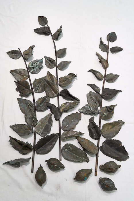Douglas Hyde Gallery is located at the bottom of Nassau Street, where students from Trinity College mingle with bookish tourists and frazzled shoppers. Abbas Akhavan’s “variations on a garden” seems initially to offer an oasis from the Black Friday bustle, the silence in the space interrupted only by the meditative drip of water into a shallow pool. That impression of sanctuary is reinforced, and then shattered, by an arrangement of bronze leaves, palm fronds, and flower stems (Study for a Monument, 2013-2016) arranged on the floor of the downstairs gallery. From the balcony, the sculptural installation resembles a set of botanical specimens for the visitor’s contemplation; on closer inspection these twisted strips of metal—enlarged bronze renderings of plants native to the banks of the rivers Tigris and Euphrates—read like wreckage from an explosion, and the white cotton sheets take on a sinister aspect.