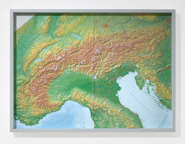 After getting comprehensively lost looking for Kevin Kavanagh Gallery, a confusing combination of turns away from the Chester Beatty Library’s exhibition of Goya’s “Disasters of War” (1810–1820), it was apt that altered and obscured maps should be the subject of Ulrich Vogl’s “The Nature of Drifting.” Alpen – half restored (2017) is a 3D rendering of the Alps, the left-hand side of which has been “restored” to its edenic state by a conservator who has laboriously painted over any marks of human civilization. Like Akhavan’s petrified plants, the work plays on the impossibility of return to pastoral idyll, unless, perhaps, the earth is wiped clean by a human hand. That the best intervention the human race could make on behalf of ecological equilibrium is literally to wipe itself out is an admittedly thin silver lining to the looming mushroom cloud.