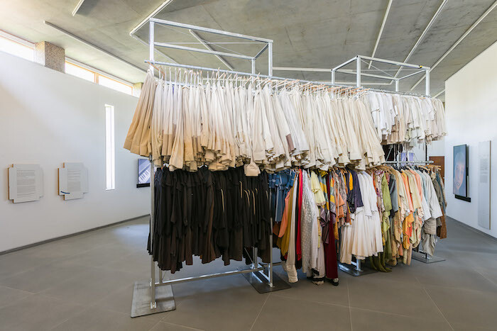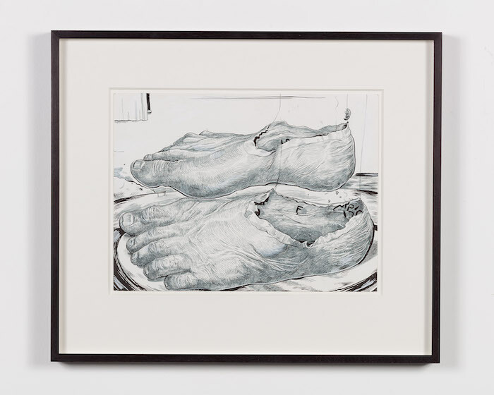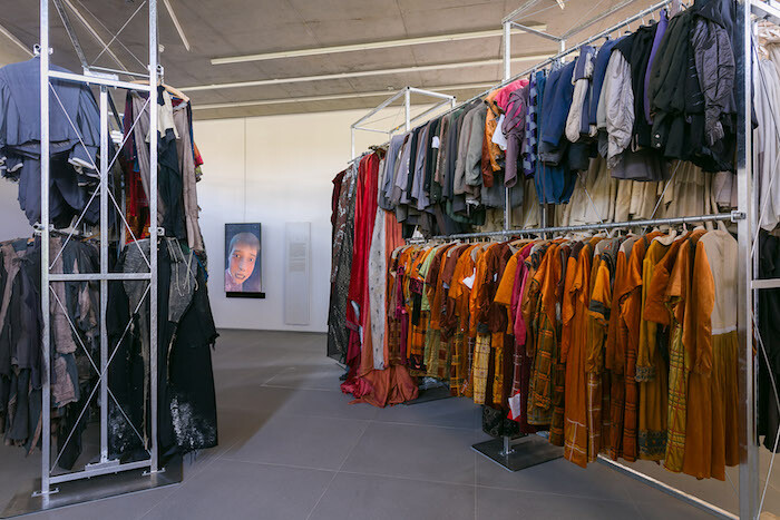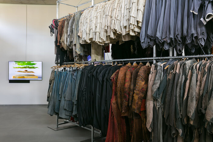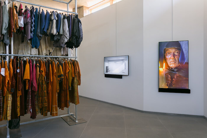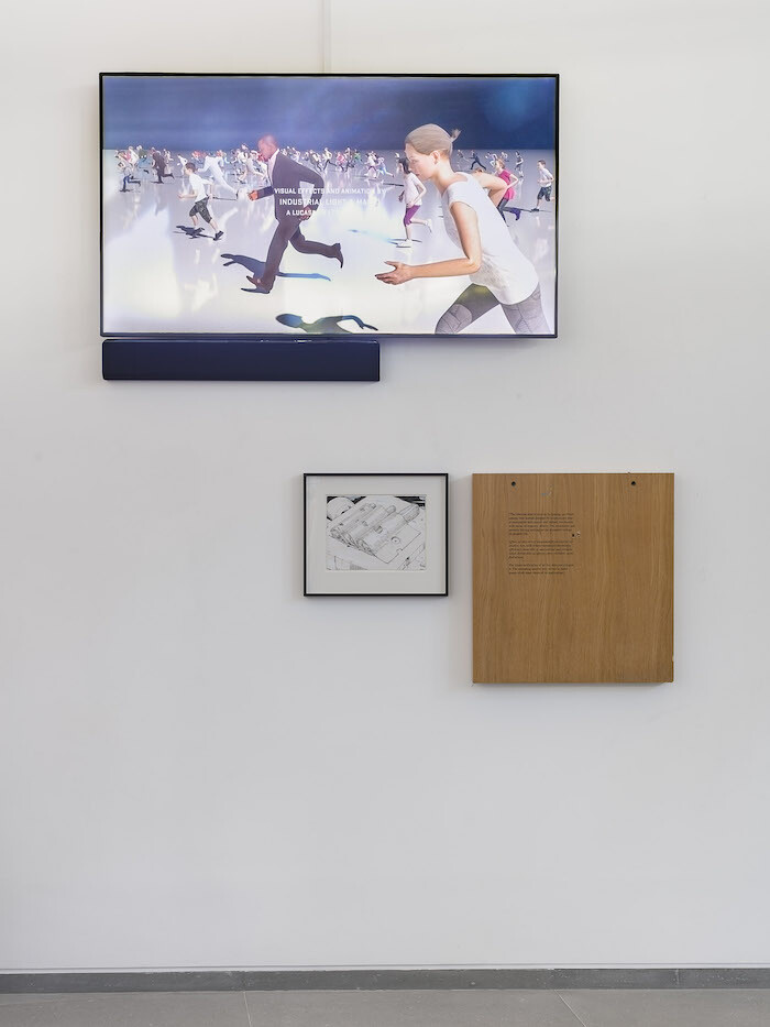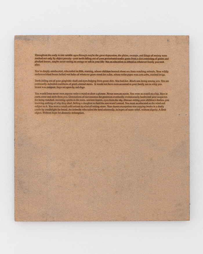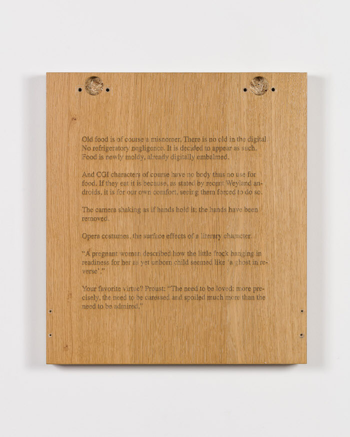 Across from Good Wine (the animations all date from 2017, the year they were shown at Berlin’s Martin-Gropius-Bau), and past a pair of monumental steel clothes rails hung with a spectacular array of old opera costumes acquired from the archives of the Deutsche Oper Berlin (Masses 1 and 2, 2018), a salvaged door is mounted to the wall (Untitled, 2017). Its darkly varnished surface is laser-etched with a cryptic text: one of several such works (all untitled) co-written by Atkins and whoever’s behind the acerbic, anonymous blog Contemporary Art Writing Daily. Some offer arch commentaries on the exhibition (“Old food is of course a misnomer”). Others read like perverted choose-your-own-adventure tales (“You were a small cold animal in a hut of rotting straw”) or eerie Wikipedia entries (“Bog bodies are preserved for millennia beneath peat tundras”). Perhaps the following sentence, from the aforementioned door, explains the boy’s fruitless exertions: “[Ed] Atkins’ protagonists are emotional crash test dummies, all literary characters are.”