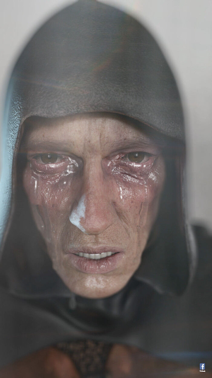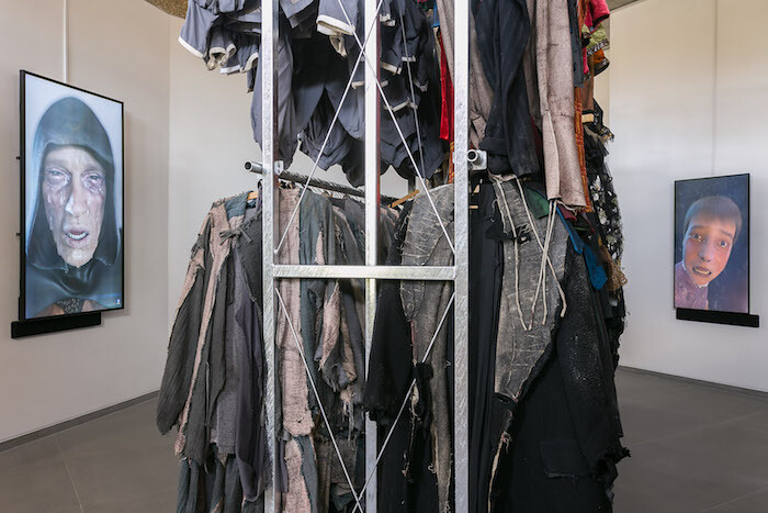 The boy is one of three such protagonists in Atkins’s current solo show at London’s Cabinet Gallery. These uncannily lifelike CGI figures—a giant baby, the frightened boy, and a craggy, hooded man who resembles a bit part from Game of Thrones—appear in digital animations, which play on flatscreen monitors mounted to the walls. Unusually for Atkins, who is known for verbose, linguistically challenging works narrated by garrulous cadavers and severed heads, these characters grunt, gasp, and whimper, but never talk. An unspecified catastrophe appears to have rendered them mute, muzzled by grief or trauma.