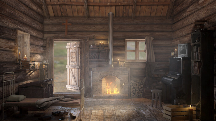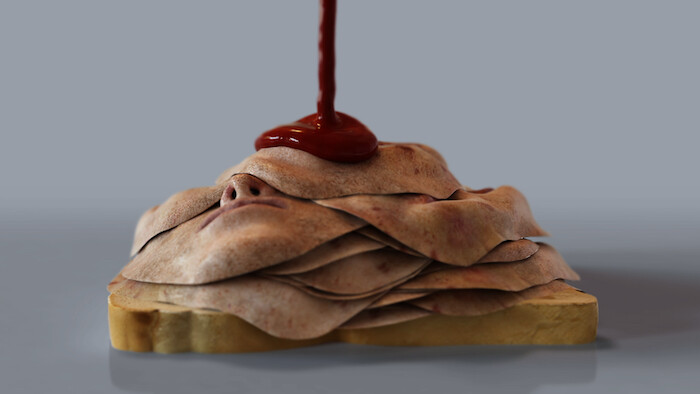 The only respite from the ominous, sodden mood is slapstick humor. In Good Bread, the baby thumps headfirst into a log cabin. Careening wildly through the air, like a jet-propelled blimp, he knocks over bookshelves and candles before drifting with sudden, spooky calm onto a stool, where he plays some minor chords on a piano. (The piece is Jürg Frey’s minimalist composition Circular Music No. 2 [2012], which functions as the melancholic leitmotif of this show.) In Neoteny in Humans, the looming infant stares at the viewer with swollen, reddened eyes. The monitor is hung in portrait orientation, which lends the animation the unnerving intimacy of a FaceTime call with a ghoulish child. As if this wasn’t disturbing enough, the baby is weeping uncontrollably. Then again, everyone’s crying in “Olde Food,” giving the show the feel of a sadistic test of the viewer’s ability to empathize. Viscous tears run down the characters’ cheeks in gluey, translucent secretions, evoking anguish in the absence of speech.