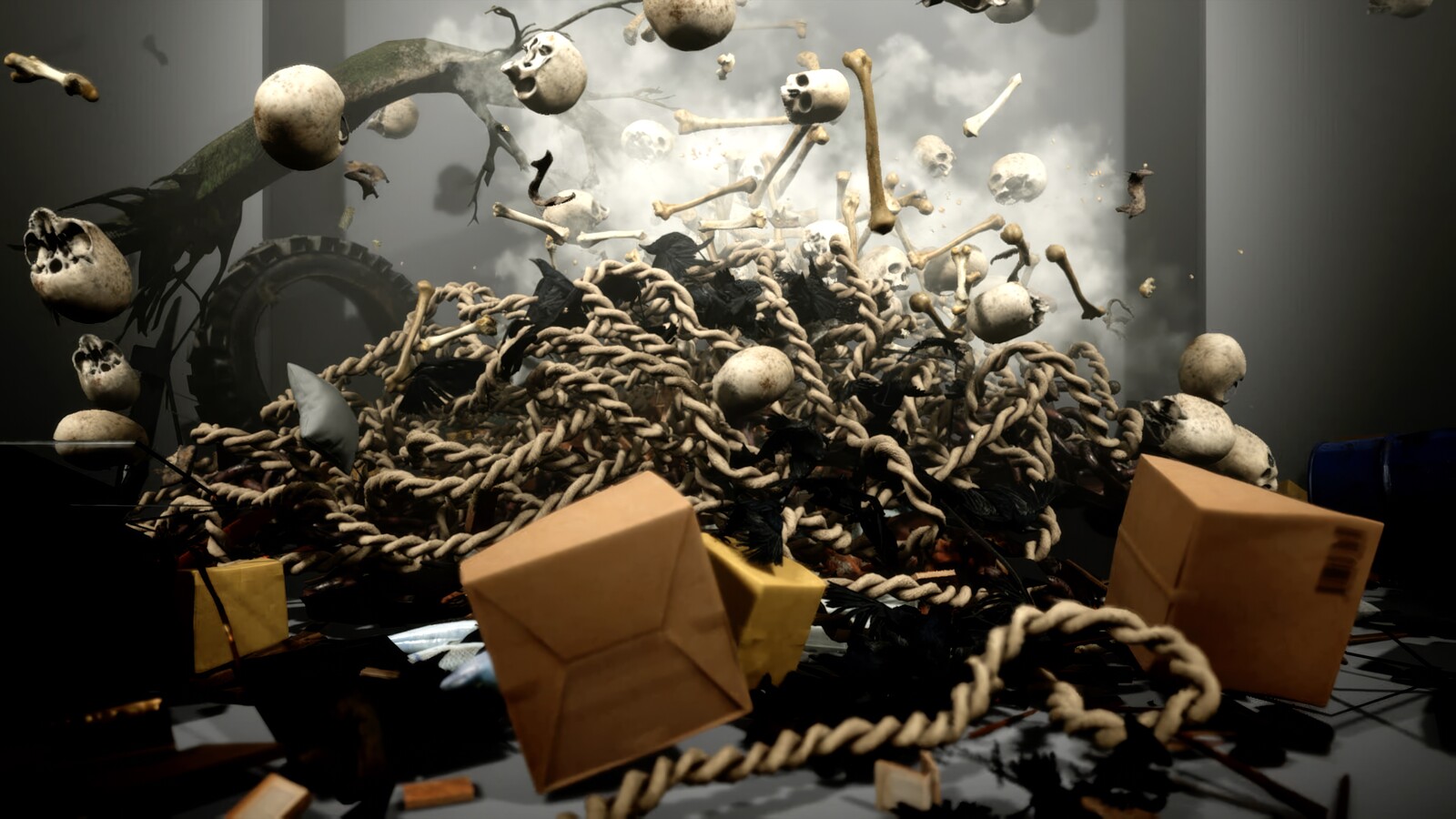 “Unquestionable” as Atkins’s love for his family may be, in isolation his increasingly explicit emphasis on personal experience is solipsistic and conservative. What makes the exhibition compelling nevertheless is that examples of this confessional approach often appear alongside remnants of his earlier negativity. Renaissance-style self-portraits hang close to undead virtual avatars; earnest first-person captions sit near opaque Wikipedia entries assembled by the anonymous blog “Contemporary Art Writing Daily”; and the Post-its share a room with Refuse.exe (2019), a computer simulation of hundreds of objects—skulls, bricks, furniture—falling through the air and crashing onto the floor. At every turn markers of authenticity and human contact are confronted with their opposites, the singularity of Atkins’s authorial voice is called into question, and the conventional chronology of a mid-career retrospective is disturbed. Traditional notions of selfhood are set in opposition to the entropic force of the digital.