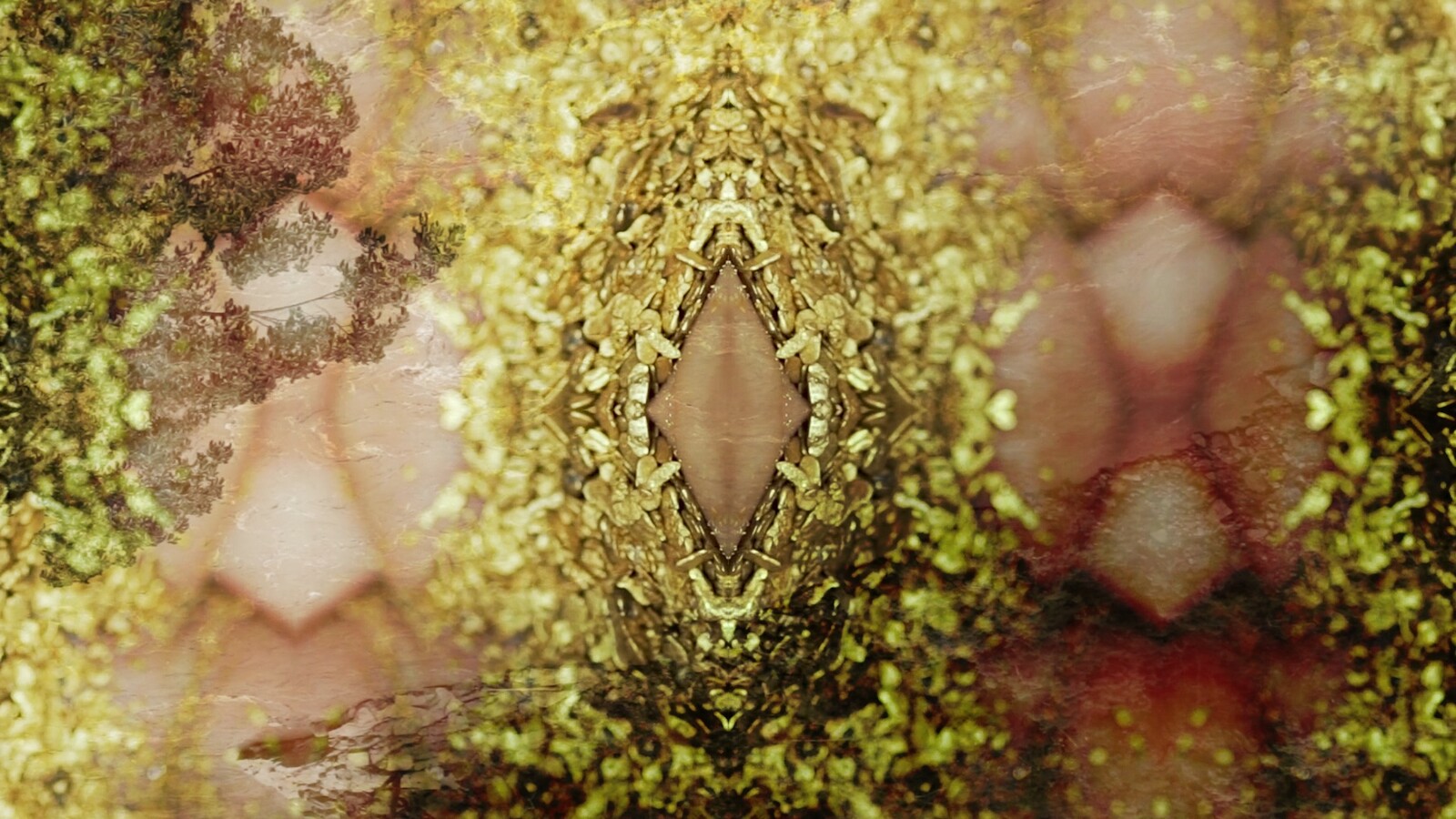 Parting curtains—and wading through this trance-inducing image flow—we reach the second gallery, where hallucination gives way to a quiet, gold-filtered space. This is the exhibition’s most sensual grouping of works, and a marked digression from its stated path. Swept up in a golden mirage, we are shuttled between spirituality, belief, and materiality. Gold is color, language, symbol, cover, and adornment, this rooms asserts—anything but a metal. Gold monochromes by Mexican artist Mathias Goeritz, Stefan Brüggemann’s gold-leafed palimpsests, and Leda Catunda’s large textile Eldorado II (2018) line the walls, while Olga de Amaral’s seven hanging Estelas (2007/2018/2019) lure us in.