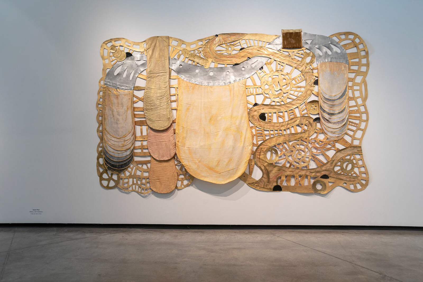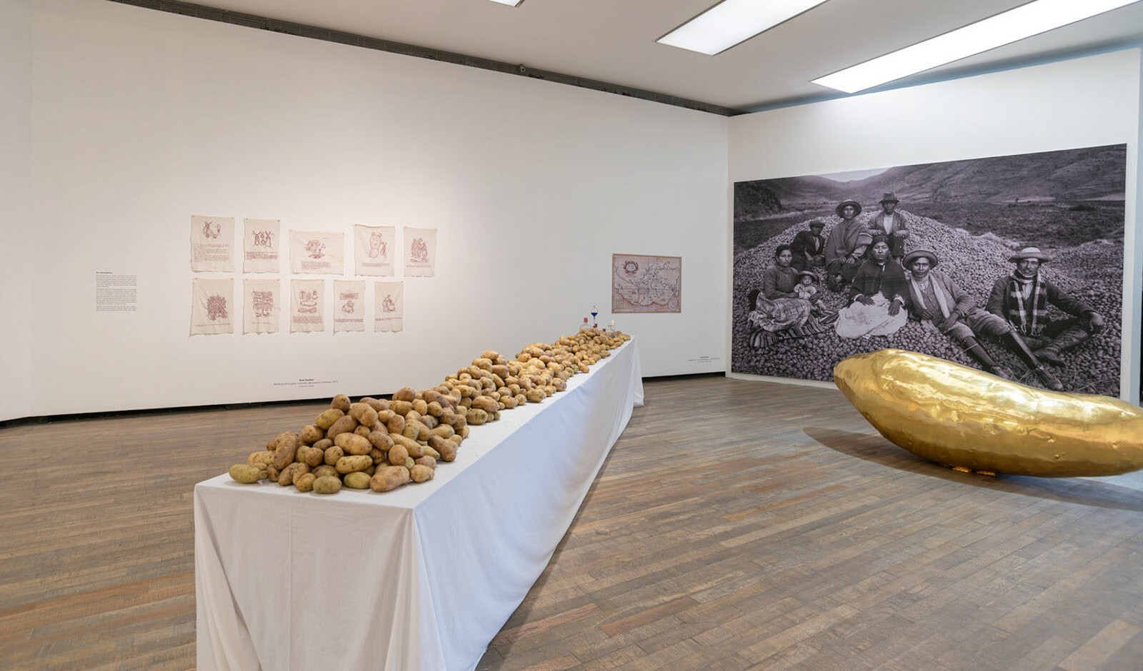 Most directly addressing the exhibition’s stated theme—territory and natural resources—the next two galleries walk a tightrope by nearly, and spectacularly, reducing natural resources to agriculture and bioeconomy. Academic and populist impulses come together in these rooms. The transposition of the theme to a space casts the works as evidence, which visitors are enticed, if not coaxed, to share as “experience.” This transposed index reduces richly multivocal works to a checklist of the continent’s flora and foodstuff—potato, corn, pepper, cacao, coca, rubber—and cochineal. Soil is also made to stand for territory. Many of these works are hemmed in while significant real estate is reserved for Instagrammable moments—vinyl-lettered Proa handles included. Generous frontage allows us to claim massive silver wings (c. 1870) for a selfie. The exquisite craft, intensive labor, and traditional knowledge of their anonymous artist(s) get lost in our angelic pictures. So do the toil and the trauma inflected on soil by silver extraction. Ximena Garrido-Lecca’s exquisite copper works profess their resilient craft, defy the exhibition’s metal aversion, and assert social conductivity.