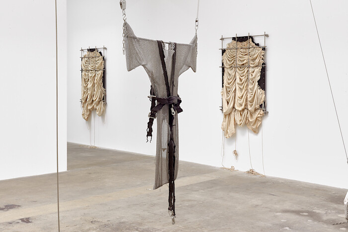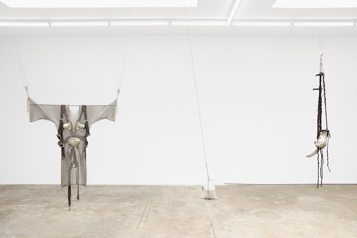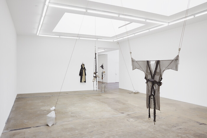 The medieval wardrobe of a sadomasochist, the secret torture chamber gear of a conflicted superhero, grim relics of gods from the deepest abysses of a broken dimension, or, as they truly are, artworks, sparsely hung, dangling from ropes, splayed like bodies, and rippled into curtains of parachute silk, with one emanating scent (as has become a regular ritual in Elaine Cameron-Weir’s exhibitions). Here it’s the ancient aroma of freshly warmed labdanum cooking in a laboratory heating element.